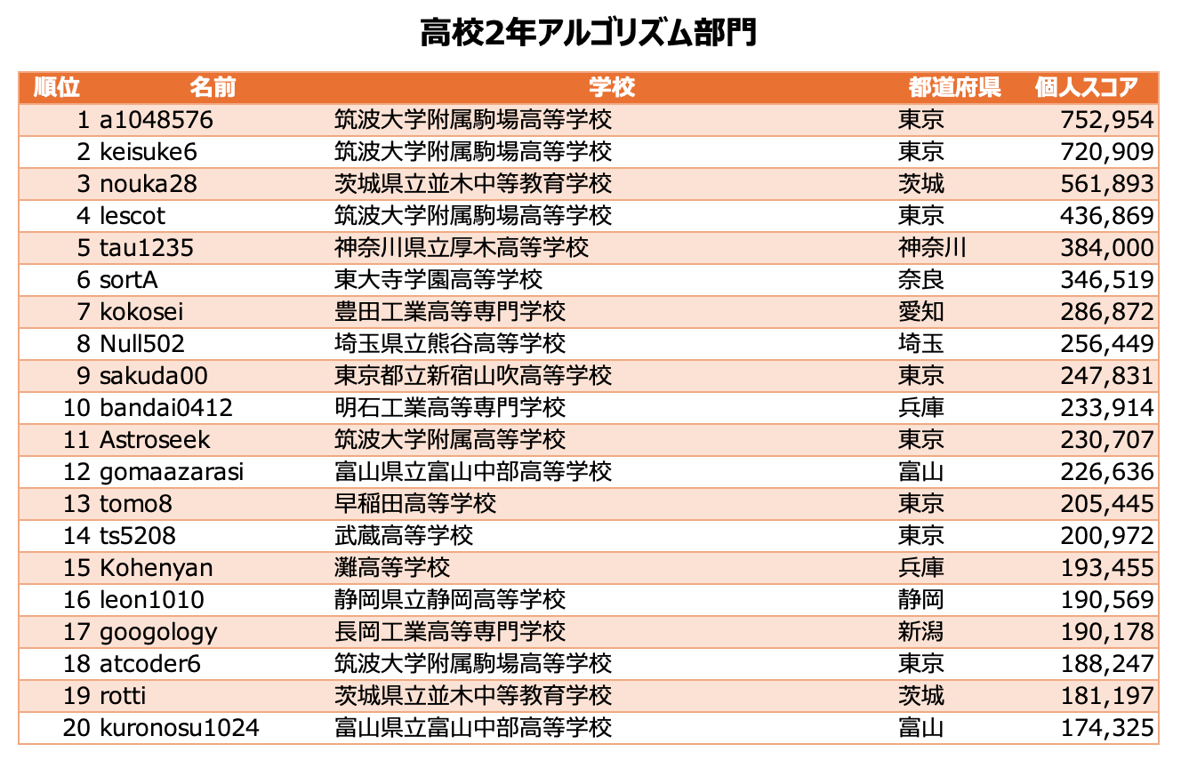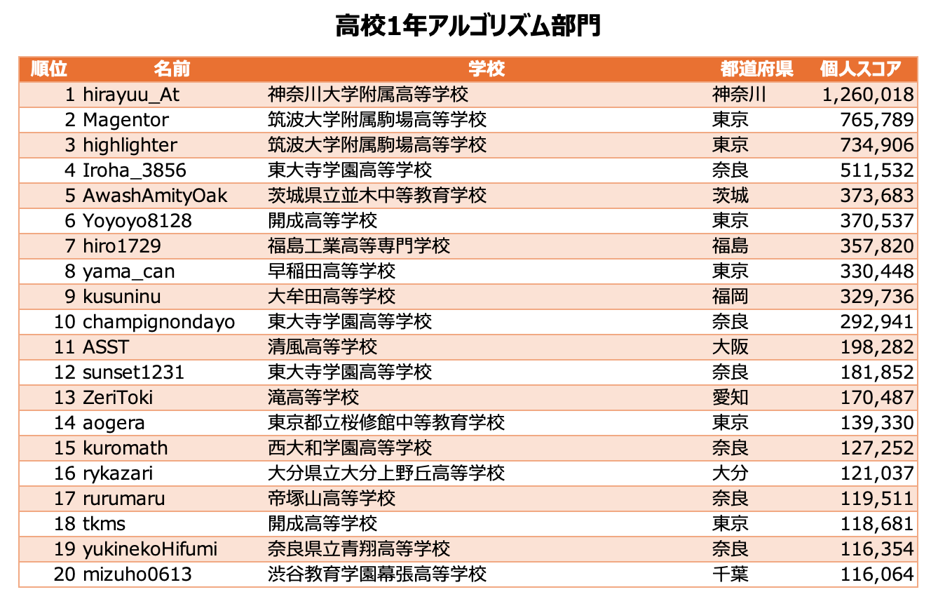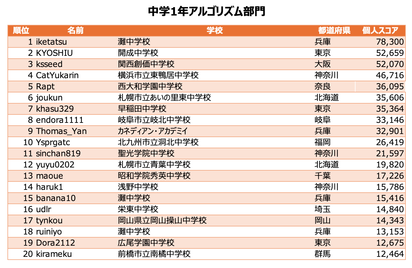 <アルゴリズム部門 都道府県別1位の中学校・高校>