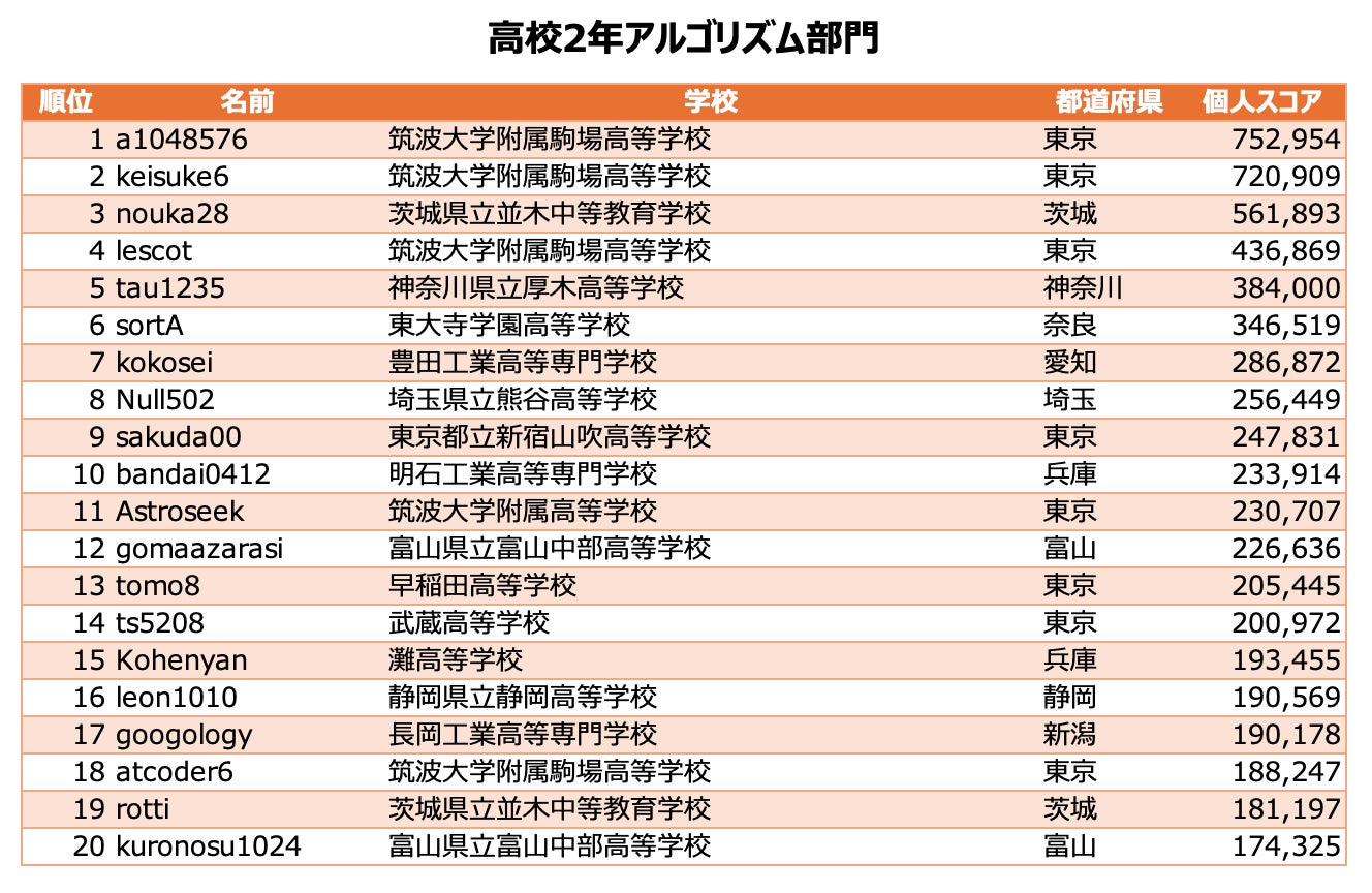 アルゴリズム部門は上位20位の中学校・高校と中学・高校各学年の上位20名、ヒューリスティック部門は上位10位の中学校・高校と中学・高校各学年の上位10名を入賞校・入賞者としてAtCoderから賞状や記念品を贈呈します。