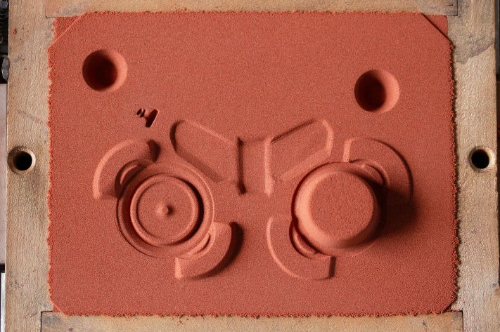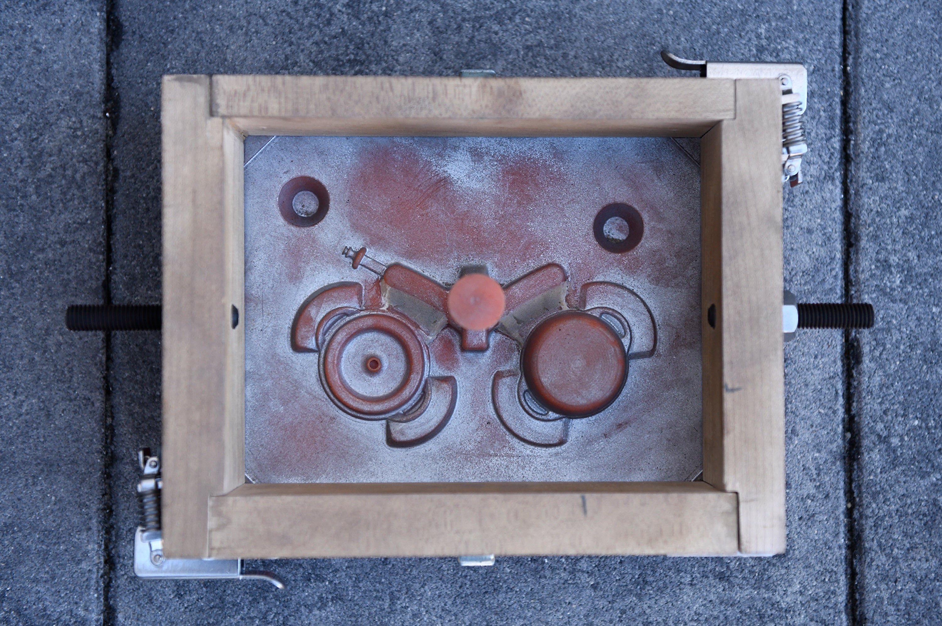 1で出来た砂型が崩れないように樹脂型から丁寧に取り外し、上型と下型を組み合わせて、錫を流しいれる湯口をつくります。湯口は錫を流し込みやすいように大きく広げ、まわりの砂はしっかり固めていきます。錫を流し込む準備が完了です!