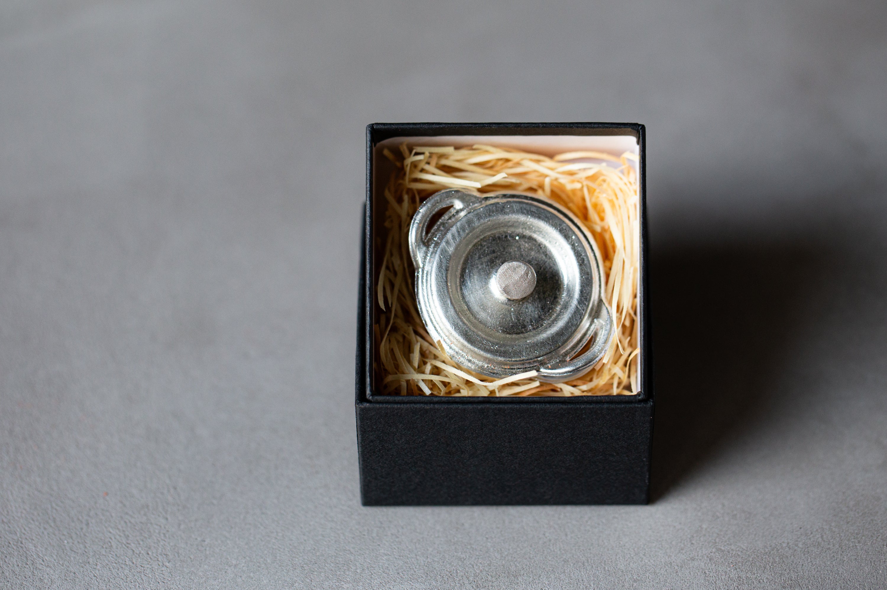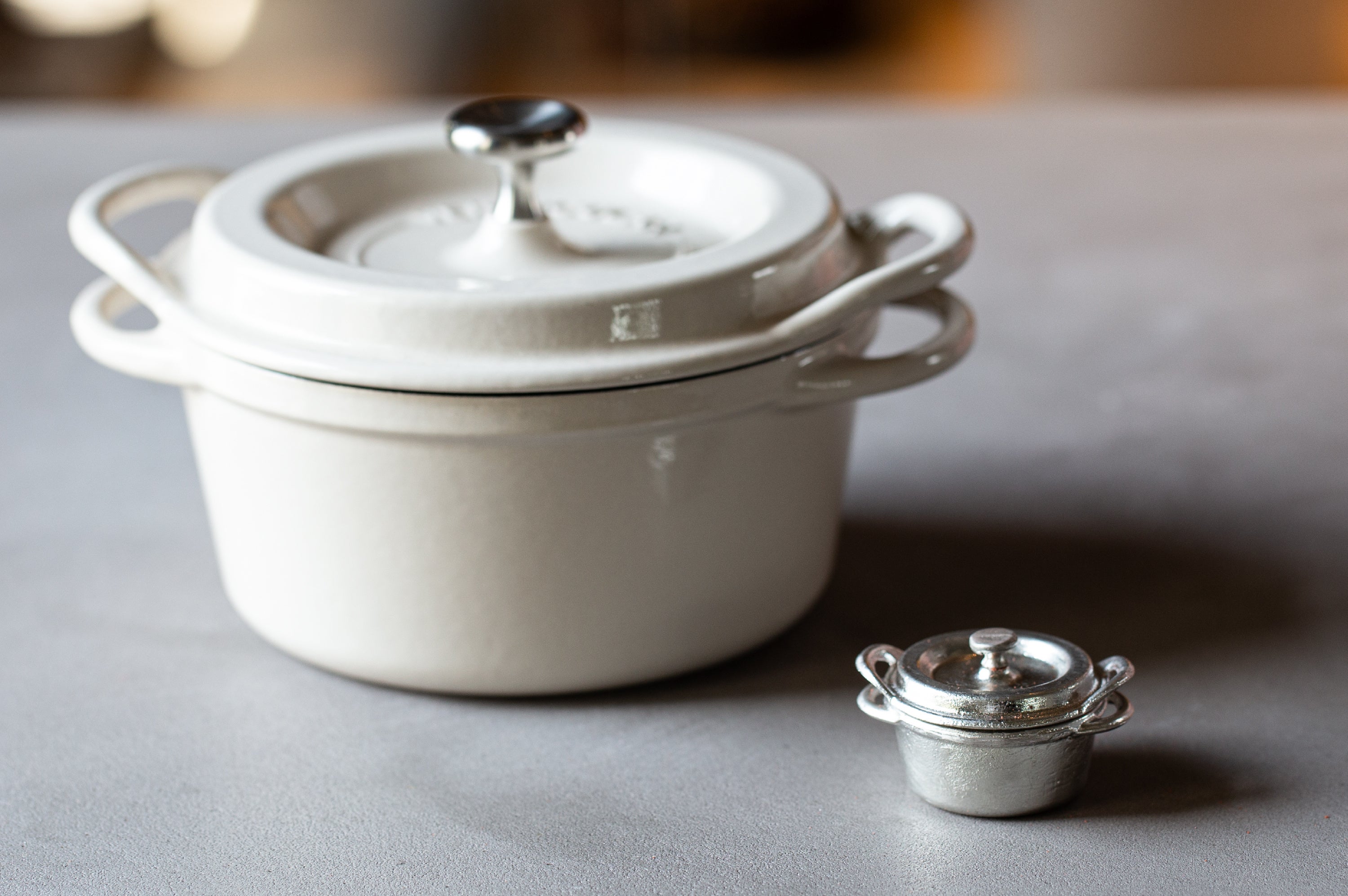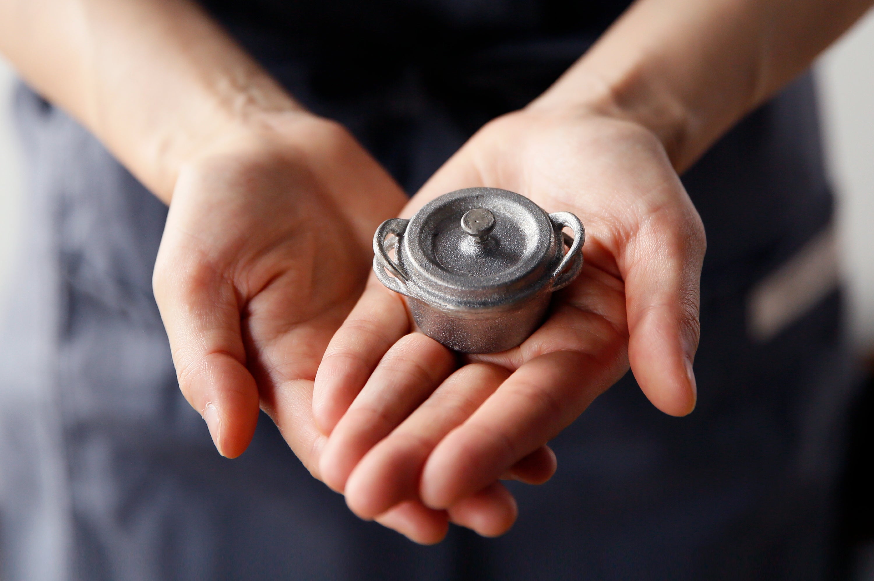 このワークショップでは、手のひらサイズのミニチュアバーミキュラを、錫を使ってご自身でおつくりいただけます。バーミキュラの鍋を製造する工程は大きく分けて、鋳造工程、精密加工工程、ホーロー加工工程の3つ。その中でも鍋の形をつくる最初の工程「鋳造」を、錫を使って体験いただけます。まず、樹脂でできた原型(げんがた)に砂を詰めて砂の型を作り、そこに250℃以上に熱した錫を流し込みます。錫が冷えて固まったら砂から取り出し、不要な部分を切り離し、表面をヤスリなどできれいに仕上げたら、ミニチュアのバーミキュラの完成です。完成した直径約3.5cmのかわいらしいミニチュアバーミキュラはワークショップ参加者だけのお土産としてお持ち帰りいただけます。