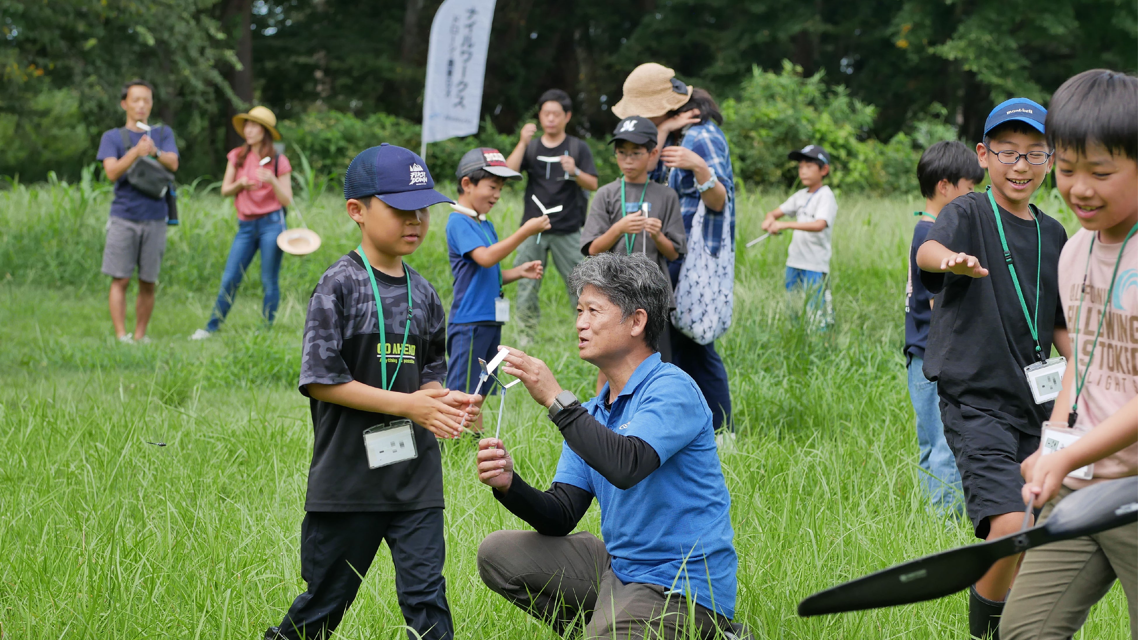 国産の自動飛行ドローンを開発するナイルワークスは、これまでに培ってきた知見を活かし、ドローンが飛行する仕組みを説明しました。ドローンが飛ぶための大切な要素のひとつ、プロペラ。牛乳パックとストローで作った竹とんぼで、プロペラの構造を考えます。羽の折り曲げ方を工夫しながら、空高く、遠くに飛ばせるようになるまで、何度も挑戦します。保護者も一緒に、のびのびと大地を駆け巡りました。