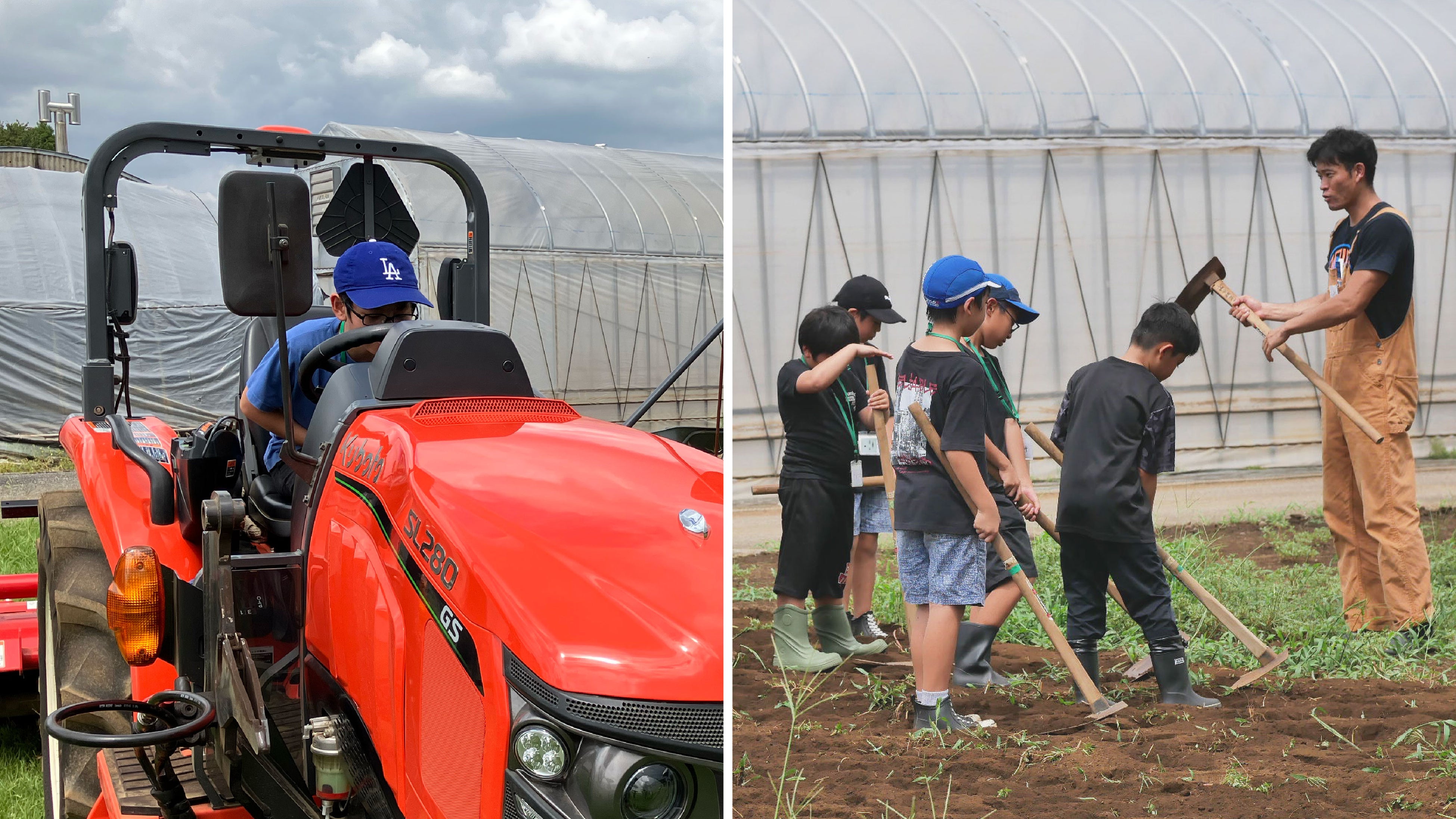 ドローン飛行に続き、マイファームのスタッフより、鍬とトラクターの違いの体験が行われました。マイファームは、「自産自消のできる社会」を目指し、体験農園や農業学校の運営、農産物の生産、流通販売事業等に取り組んでいます。作物が育ちやすい環境を作るために重要な土づくり。鍬で土を耕す体験とトラクターの実演見学を通して、子どもたちは、昔と今の農業の違いを体感します。
