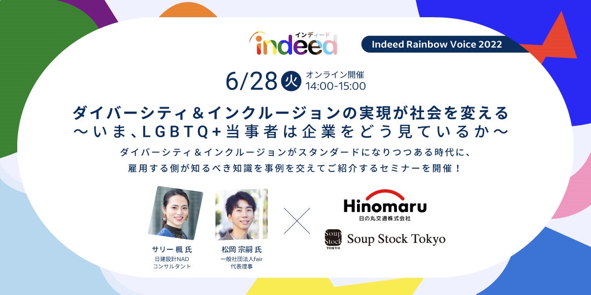 本セミナーは、一般社団法人fair代表理事 松岡宗嗣氏をモデレーターに迎え、Indeed Japan株式会社に加え、さまざまなLGBTQ+当事者支援の取り組みを実施している株式会社スープストックトーキョー、日の丸交通株式会社の3社、そして、LGBTQ+当事者でもある建築デザイナーのサリー楓氏が登壇予定です。『Indeed Rainbow Voice2022』プロジェクトでは、4月から5月にかけてLGBTQ+当事者の方々の職場や仕事に関する悩みや声を広く募集してまいりました。それらの声を元に、企業におけるダイバーシティ&インクルージョンを実現するために、どんな制度や取り組みが必要か、職場ではどのような配慮が求められているのか、などをさまざまな立場から一緒に考えていきます。