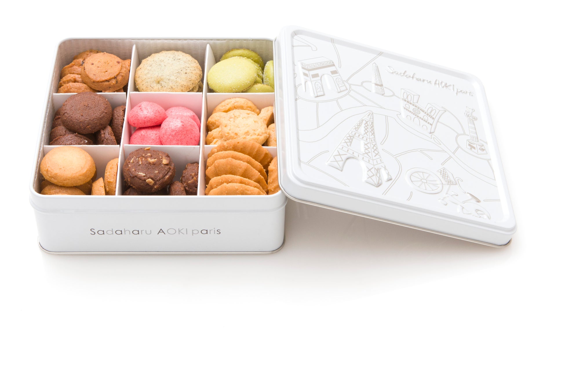 白とシルバーを基調としたパリの街並みが描かれた缶に、こだわりの製法で作り上げた焼き菓子を詰め合わせた人気の缶入りクッキー。アールグレイのサブレにフランボワーズのコンフィチュールをサンドした「アールグレイ」、甘酸っぱいイチゴを使ったメレンゲ「ムラング フレーズ」など、9種の味がお楽しみいただけます。