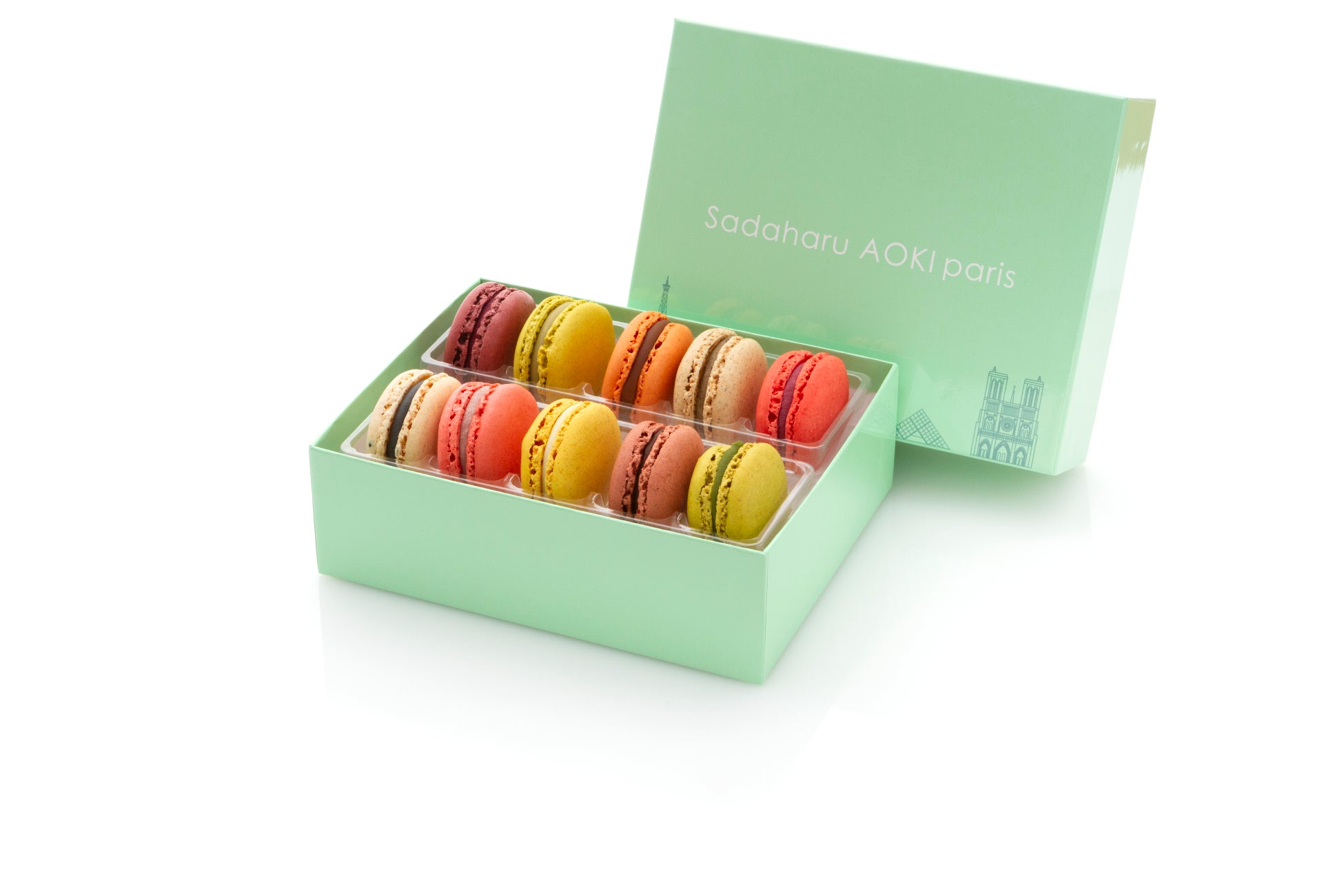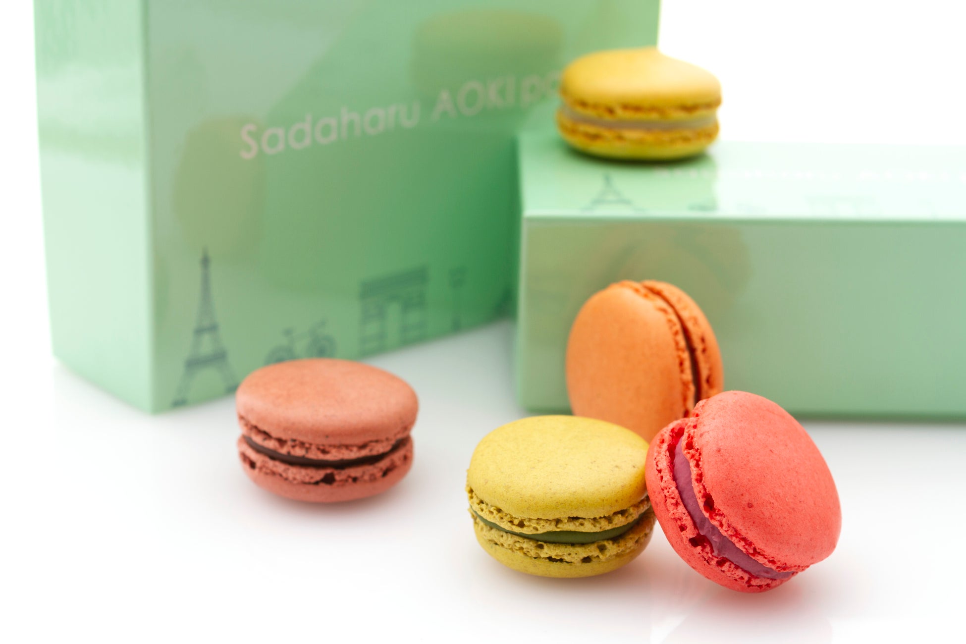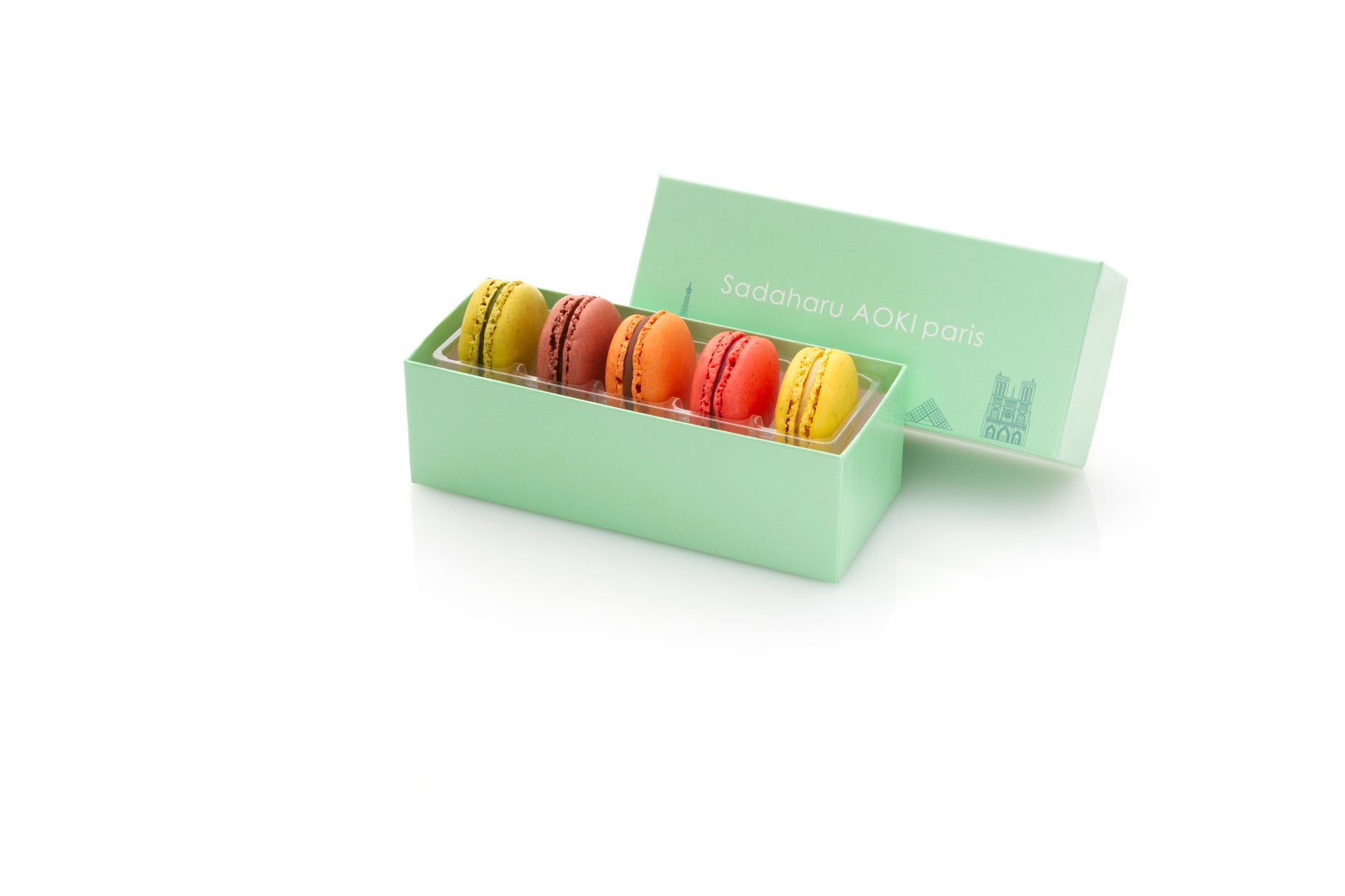 ホワイトデーの贈り物の定番になりつつある「マカロン」。アオキのマカロンは、本場パリの美味しさをお楽しみいただきたいというシェフの強い想いから、素材と製法にこだわり抜いた自慢のマカロンをパリ直輸入でご用意しています。スペイン産アーモンドを使用しサクッと軽やかな食感に焼き上げたマカロン生地に、イタリア「ドモリ社」のショコラをベースとしたなめらかなクリームをサンドしたアオキのスペシャリテ。今年はキュートなミントグリーンのパッケージで登場します。