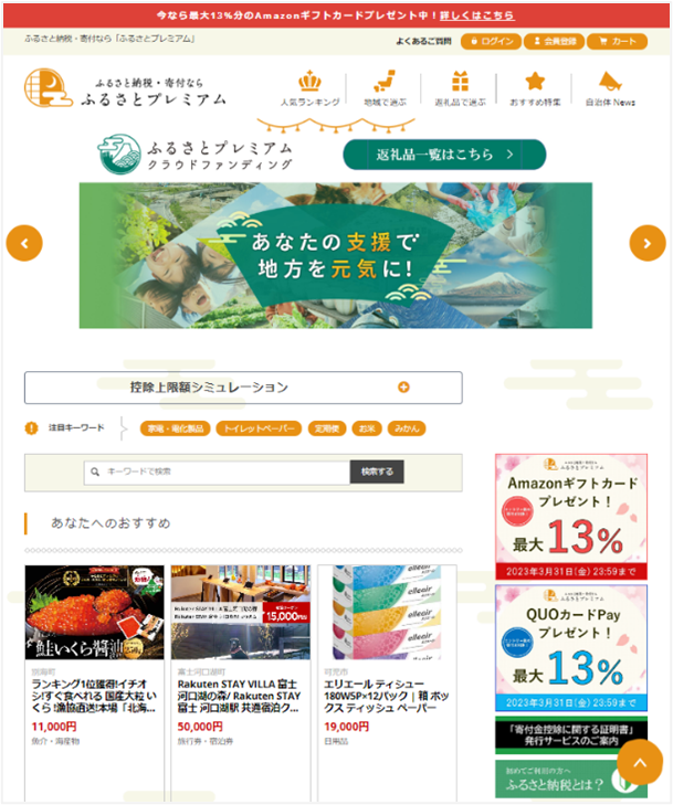 当社が運営する「ふるさとプレミアム(https://26p.jp/)」は、2017年1月よりサービス開始し、掲載自治体数約230自治体(※2023年2月時点)約80,000点の返礼品が登録されたふるさと納税ポータルサイトです。