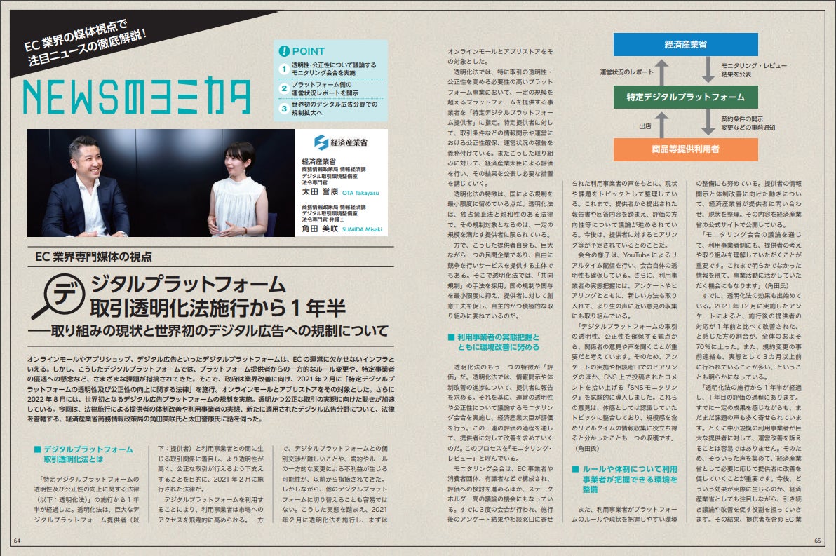 今号では、政府が業界改善に向け、2021年2月に施行した「特定デジタルプ ラットフォームの透明性及び公正性の向上に関する法律」における取組の現状などについて、経済産業省の 太田 誉康氏と角田 美咲氏に話を伺いました。