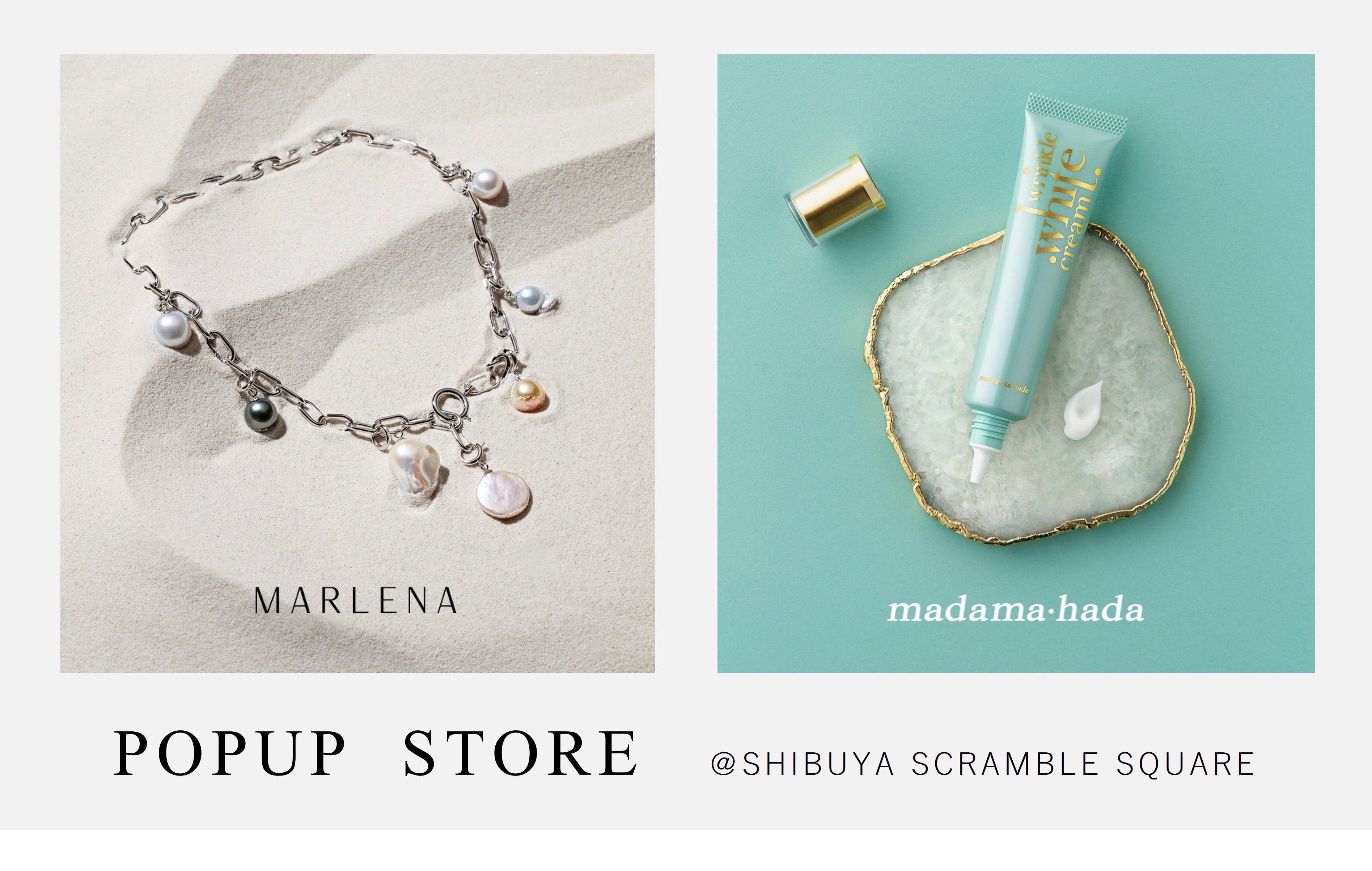 真珠の卸を手掛ける(株)WSP発のジュエリーブランド〈MARLENA〉とコスメブランド〈madama・hada(真珠肌)〉が、渋谷スクランブルスクエアでPOP UP STOREを出店。