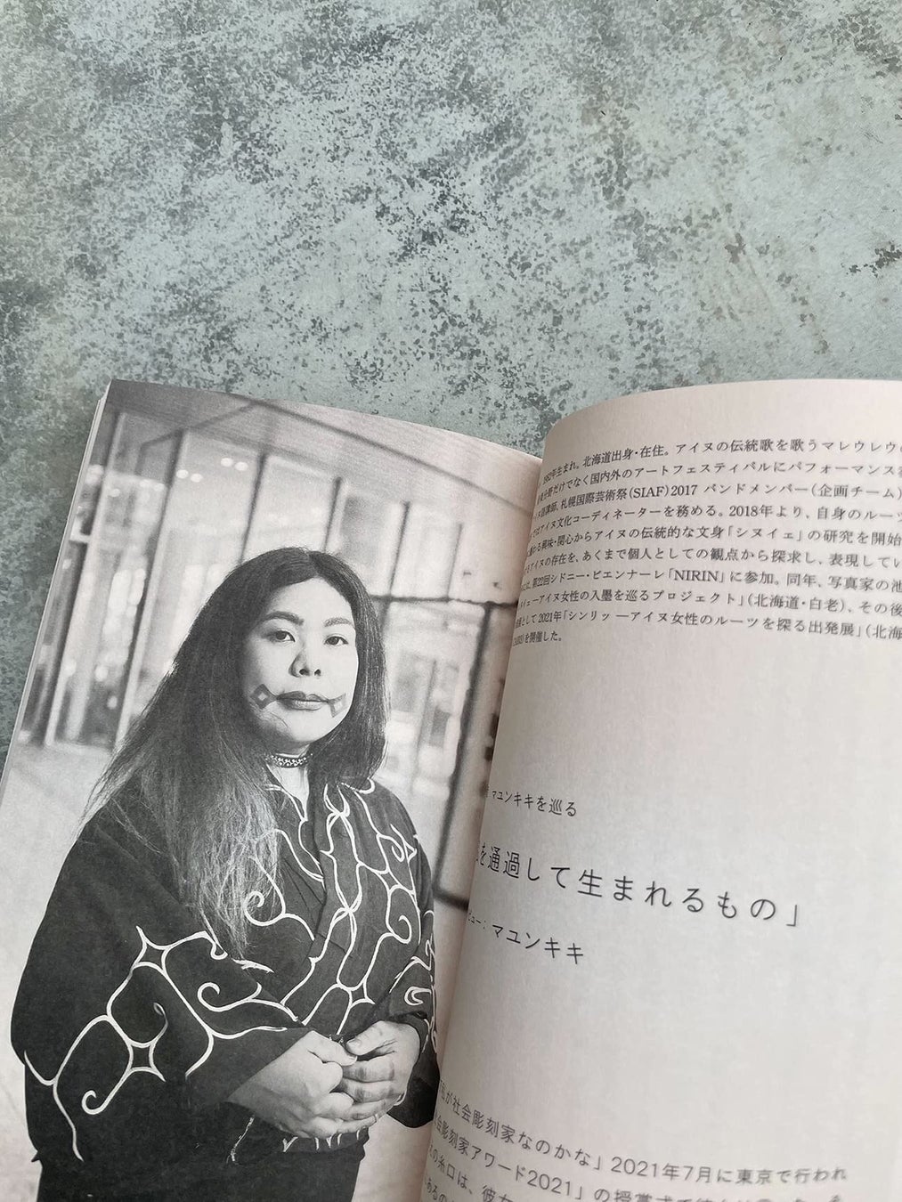 1982 年生まれ。北海道出身・在住。アイヌの伝統歌を歌う「マレウレウ」のメンバー。音楽分野だけでなく国内外のアート フェスティバルにパフォーマンス参加多数。アイヌ語講師、札幌国際芸術祭(SIAF)2017 バンドメンバー(企画チーム)、SIAF 2020 ではアイヌ文化コーディネーターをつとめる。2018 年より、自身のルーツと美意識に纏わる興味・関心からアイヌの 伝統的な文身「シヌイェ」の研究を開始。現代におけるアイヌの存在を、あくまで個人としての観点から探求し、表現して いる。2020 年には、第 22 回シドニー・ビエンナーレ「NIRIN」に参加。同年、写真家の池田宏と「シヌイェアイヌ女性の 入墨を巡るプロジェクト」(北海道・白老)、その後の初めの個展として 2021 年「シンリッ アイヌ女性のルーツを探る出発 展」(北海道・札幌、CAI03)を開催した。https://www.tonkori.com