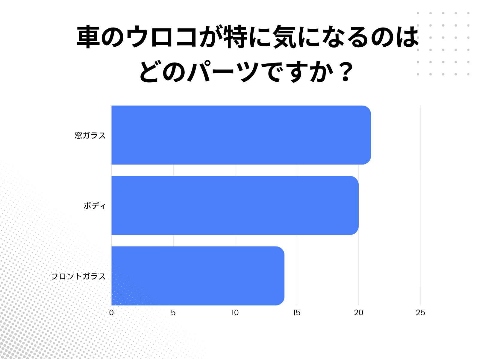 「水垢・ウロコが特に気になるパーツ」では、窓ガラス・ボディ・フロントガスのどの汚れが気になる人も多いという結果に。