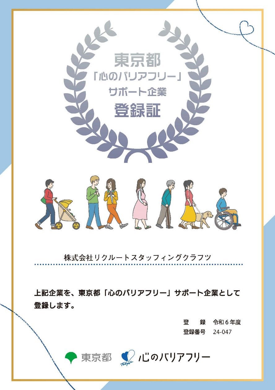 リクルートスタッフィングクラフツ、東京都「心のバリアフリー」サポート企業に登録