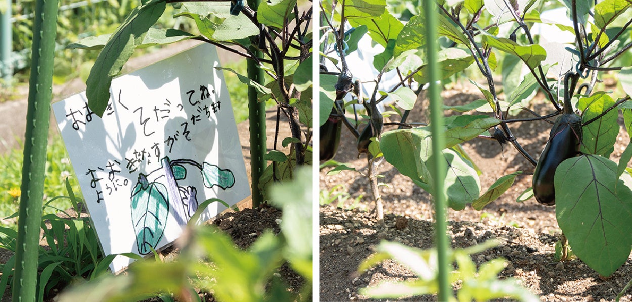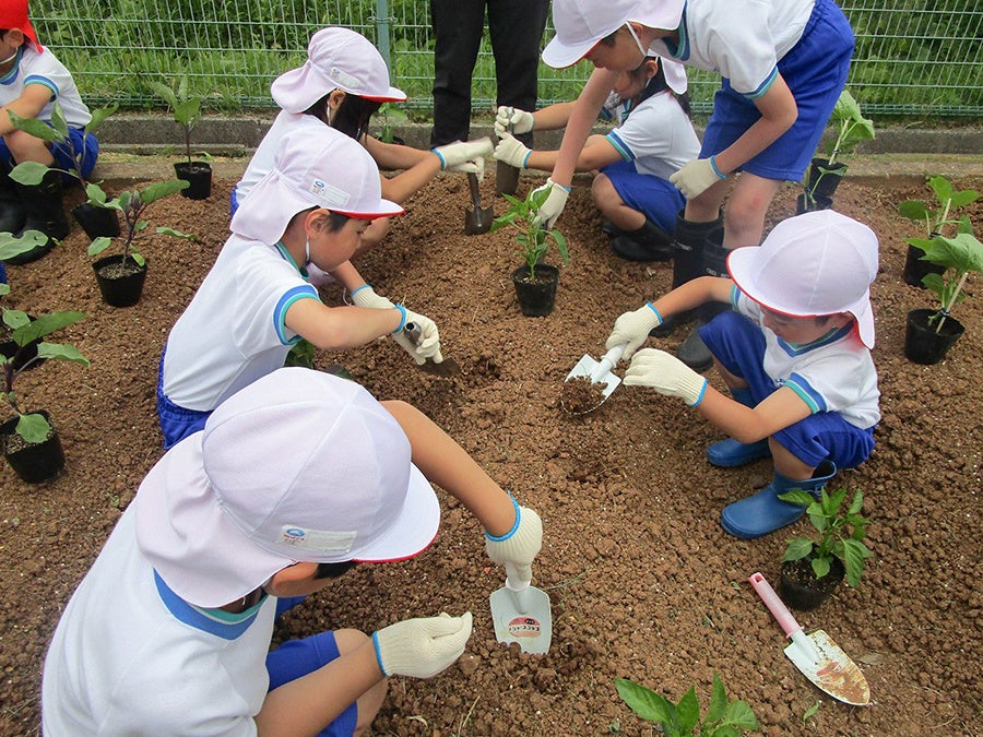 2023年5月25日には、小木小学校の1、2年生とたんぽぽ学級の子どもたちが、学校内にある畑でBONEARTHを使った農業を体験。JA協力のもと、ナス、キュウリ、オクラ、ピーマン、サツマイモ、ミニトマトの6種類の野菜の苗植えを行いました。