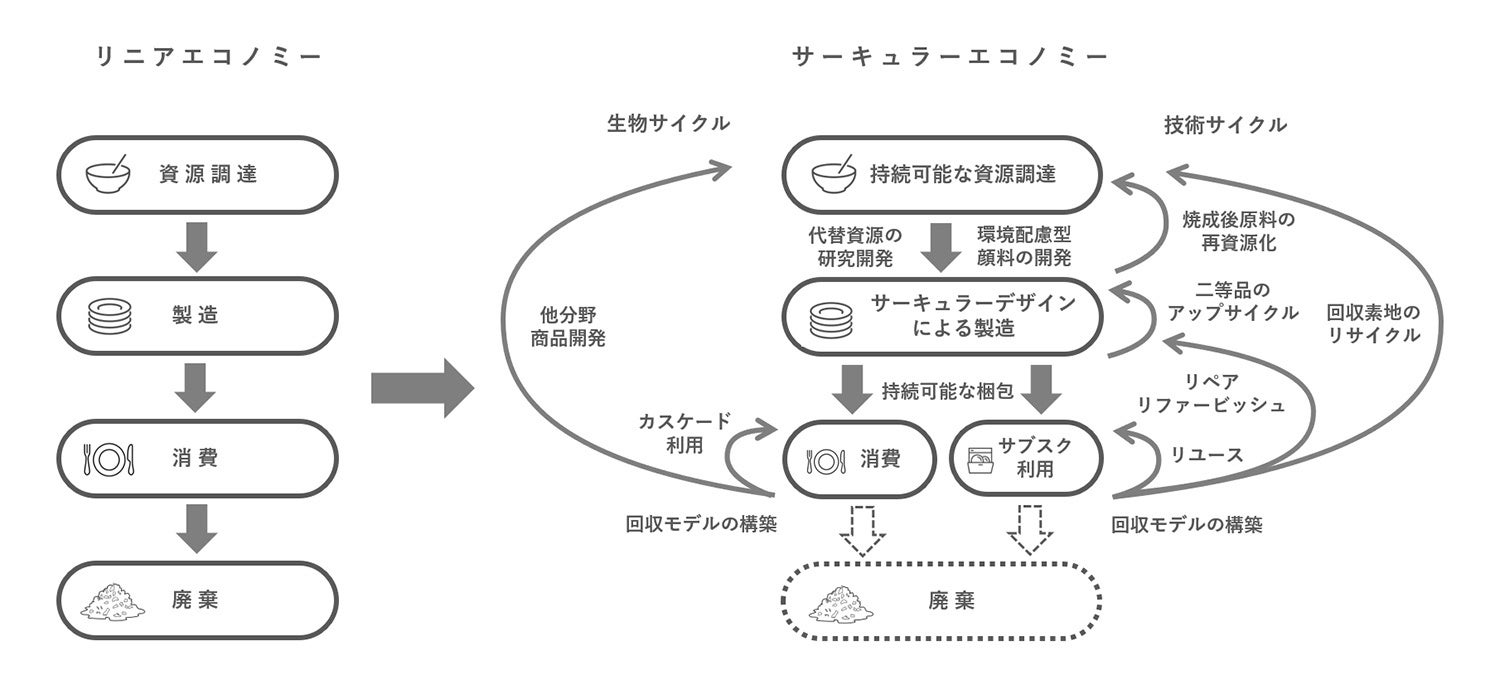 ニッコーでは「100年後の、循環する未来をデザインする」をテーマに、陶磁器事業を中心に「サーキュラーエコノミー(循環経済)」の原則に沿った取り組みを進めてまいりました。次の100年も陶磁器づくりを続け、豊かな食とそれを楽しむ時間を守り続けていくためには、大量生産・大量消費・大量廃棄を前提としたリニア型のビジネスモデルから脱却する必要があると考えています。製品づくりの段階から廃棄が出ない設計を考え、一度調達した資源ができる限り社会の中で循環し続けるサーキュラー型のビジネスモデルへの変革を目指すため、さまざまなアプローチを検証しています。
