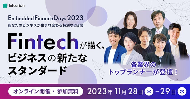 株式会社インフキュリオン(本社:東京都千代田区、代表取締役社長:丸山 弘毅、以下「インフキュリオン」)は、Embedded Finance(エンベデッド・ファイナンス/組込型金融)※1をテーマに、Fintechで事業を成長させるノウハウを共有するオンラインイベント「Embedded Finance Days 2023」を11月28日(火)~11月29日(水)の2日間にわたり開催します。本イベントでは、鉄道、商社といった歴史ある企業から、新たなビジネスモデルで急成長しているスタートアップ企業まで各業界のトップランナーが集まり、自社の取り組みについて紹介するほか、国際的に注目を集めるCBDC(中央銀行デジタル通貨)について有識者を招いたパネルディスカッションを行うなど多彩なテーマの講演を全8講演配信します。