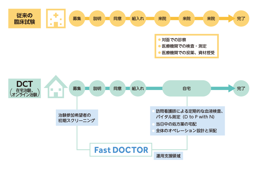 そこで今回、在宅医療、オンライン診療(D to P with N含む)の経験が豊富なファストドクターは、COVID-19の後遺症治療薬を研究・開発する治験実施医療機関にパートナーとして選定され、DCTの運用支援を行うことといたしました。