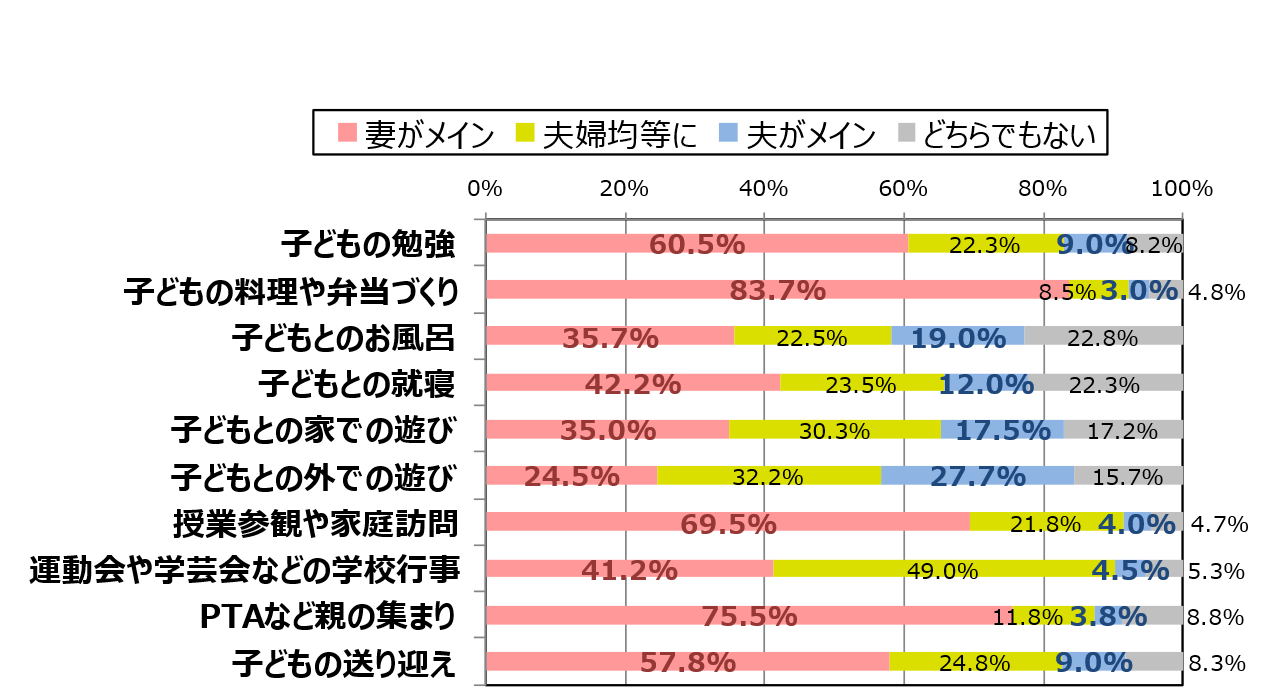 しかし、子育て全般についての妻と夫の役割分担について確認してみると、妻側にかなり大きな負担があることがデータで明確に表れました。妻がメインで50%の過半数を超えるのは、高い順に「子どもの料理や弁当づくり」83.7%、「PTAなどの親の集まり」75.5%、「授業参観や家庭訪問」69.5%、「子どもの勉強」60.5%、「子どもの送り迎え」57.8%と、子どもの教育の負担の多くが妻にかかっていることが明らかに。夫が妻よりもメインで担当しているのは「子どもとの外での遊び」27.7%しかありません。男性の育児参加の動きがある中で、家事だけでなく教育においても子育ての負担が女性に極端に偏っている実態は大きな課題といえそうです。
