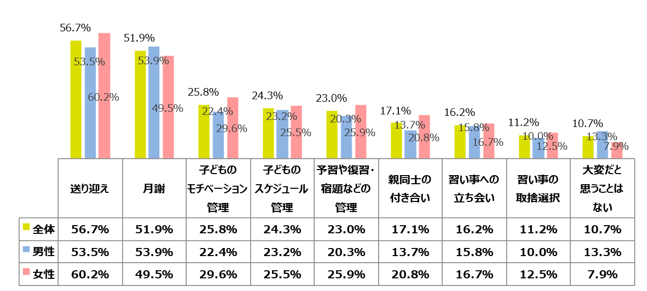 学校以外にも習い事など忙しい現代家庭において、習い事に関して大変だと思うことを聞いてみました。その結果「送り迎え」が56.7%でトップとなり、以下「月謝」51.9%、「子どものモチベーション管理」25.6%と続きます。お金の問題は習い事に関してよく出てくることだと思われますが、それ以上に送り迎えが大変というのは面白い結果です。男女差を見たところ、若干女性の方が大変と感じている傾向があるものの全体平均からかけ離れることはありません。