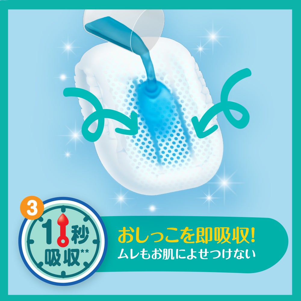 3つに分かれた吸収体が、おしっこを分散させて即吸収する「3つのマジック吸収体」を採用。最長12時間、赤ちゃんのお肌をさらさらに保ちます。