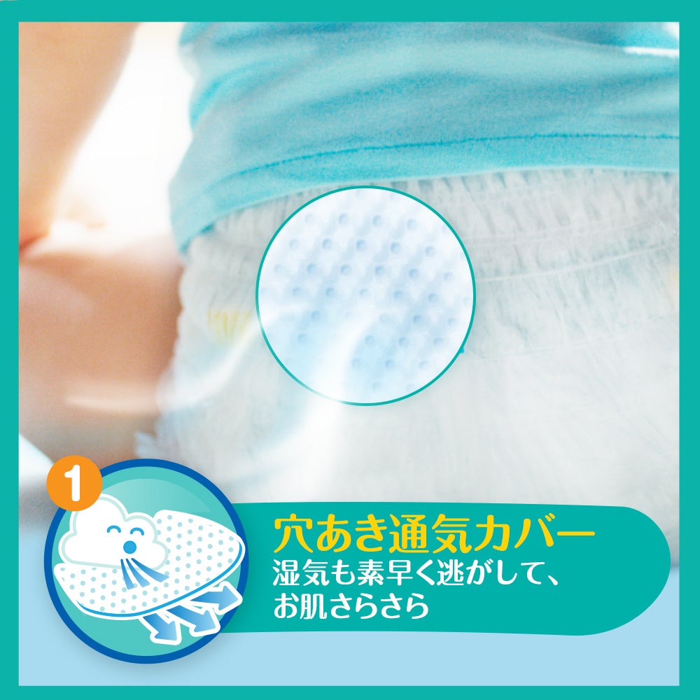 おむつの外側のシートに通気孔を採用。おむつの中のムレを外に逃がして、赤ちゃんのおしりをさらさらに保ちます。
