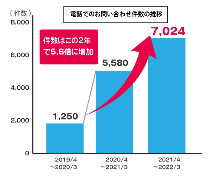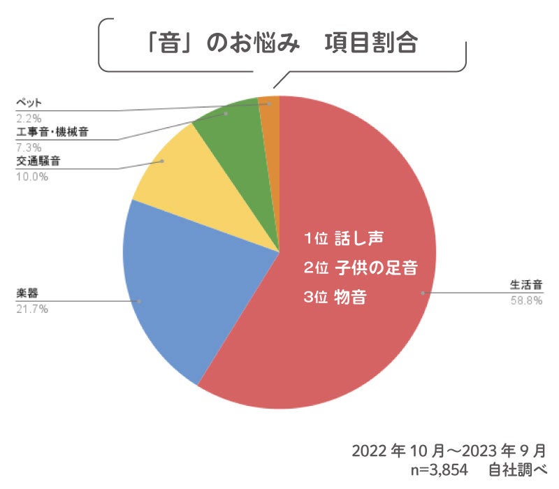 日本の7大公害の一つと言われている「騒音」問題。特にコロナ禍以降、全国的に騒音に係る苦情の件数は増加傾向にあります。同社では騒音に関する電話相談が、コロナウィルス流行時以前と比較して 約5.6倍 に急増し、直近のデータ(2022/10/1〜2023/09/31、3,854件)によると、全体のご相談のうち58.8%を「生活音」によるお悩みが占めました。