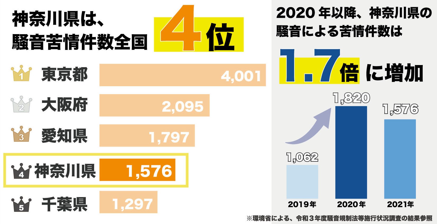 今回ポップアップイベントで出展をする神奈川県は、令和3年度の騒音苦情件数が全国4位(※)とかなり上位に挙がっており、コロナ禍での騒音による苦情件数も増加傾向にあります。