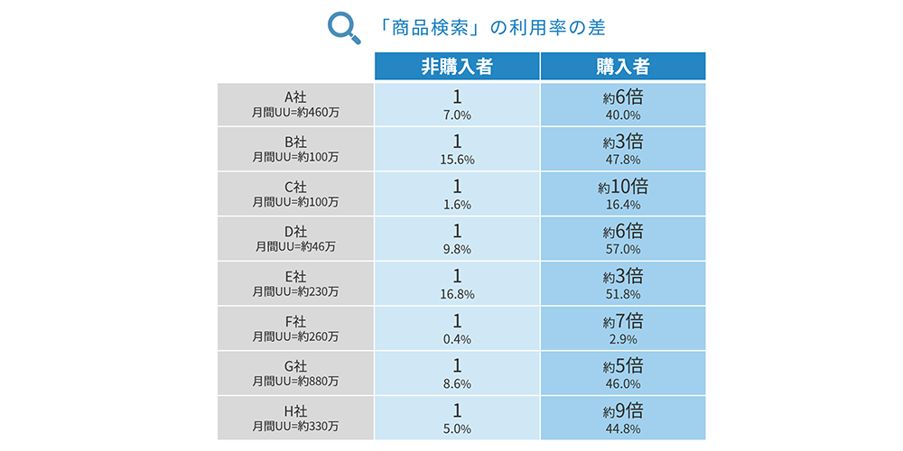 まず、「商品検索」について見ていくと、最小でも約3倍、最大では約10倍、利用率に違いがあることがわかりました。