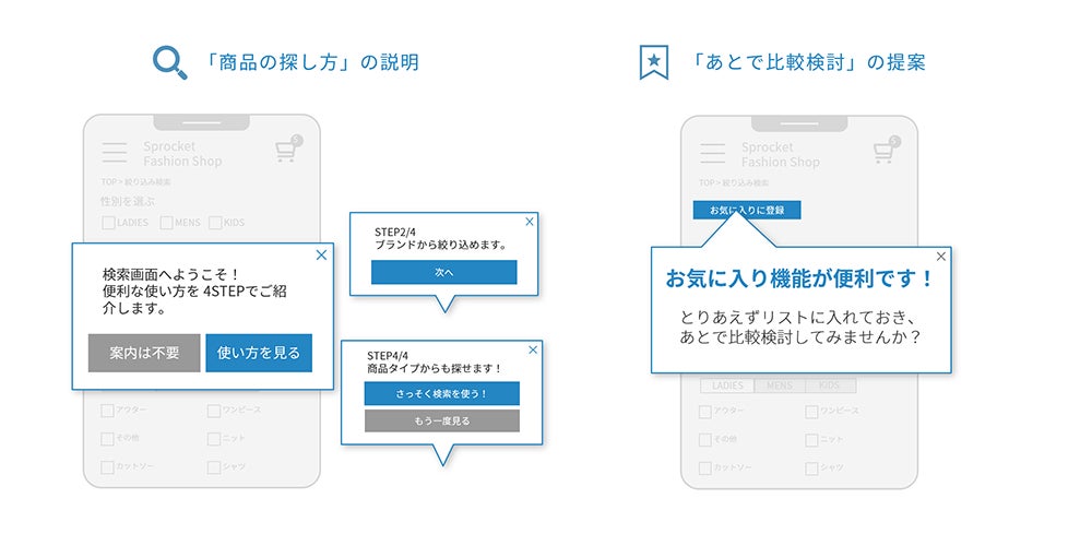 例えば、「商品検索」なら、「商品の探し方」を順を追って説明します。「お気に入り登録」の場合は、まずはそういった機能があること自体を気づかせるといったことが考えられます。