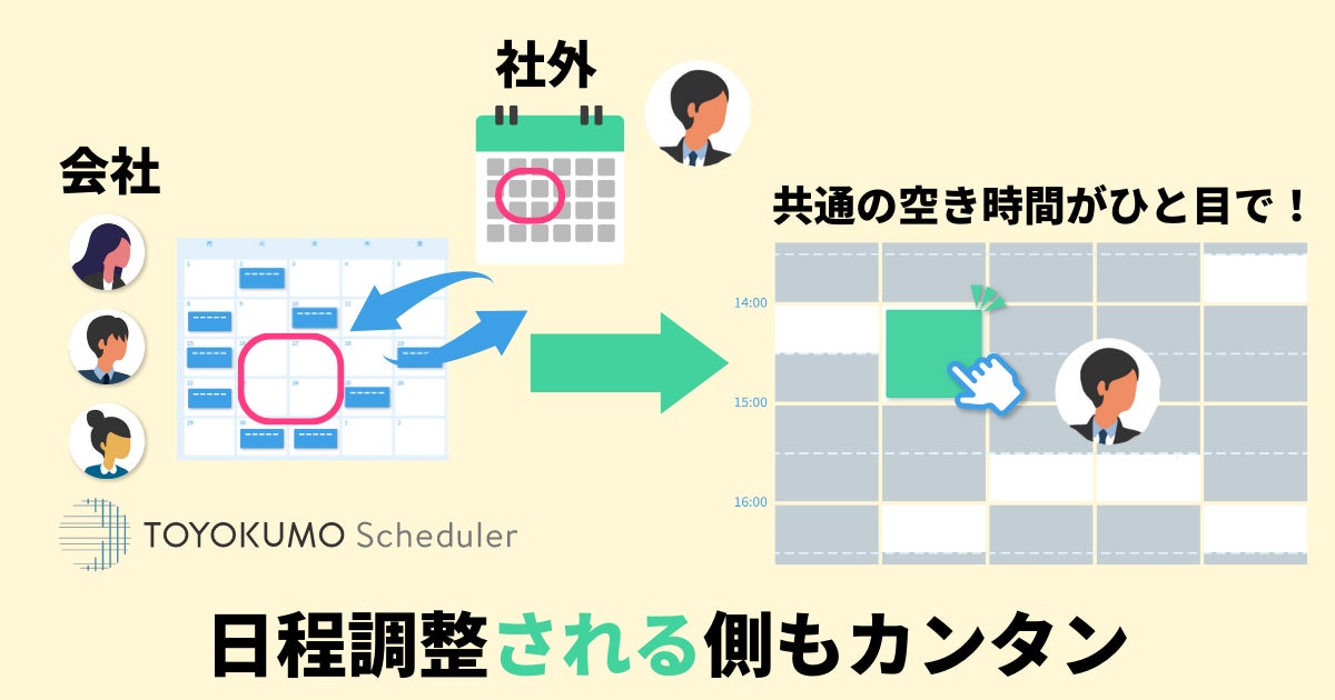 トヨクモ株式会社(本社:東京都品川区、代表取締役社長:山本 裕次、以下トヨクモ)は、社内・社外を問わず日程調整を簡単に行うことができるスケジューラー「トヨクモ スケジューラー」をバージョンアップし、社外のユーザーが日程調整を依頼された際に、自分のカレンダーの予定と照らし合わせて日程を選ぶことができる機能を追加します。