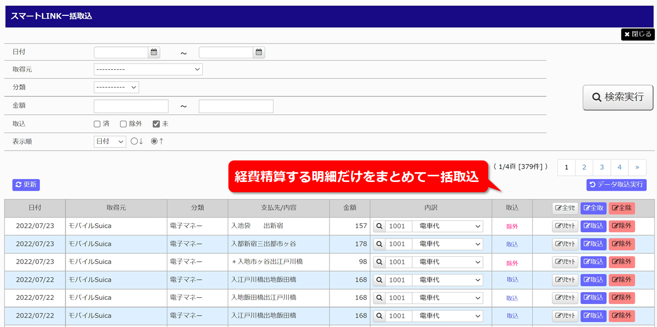 - ワンクリックでスマホの交通系電子マネーの利用履歴を一括取得し、交通費精算の手間を大幅削減