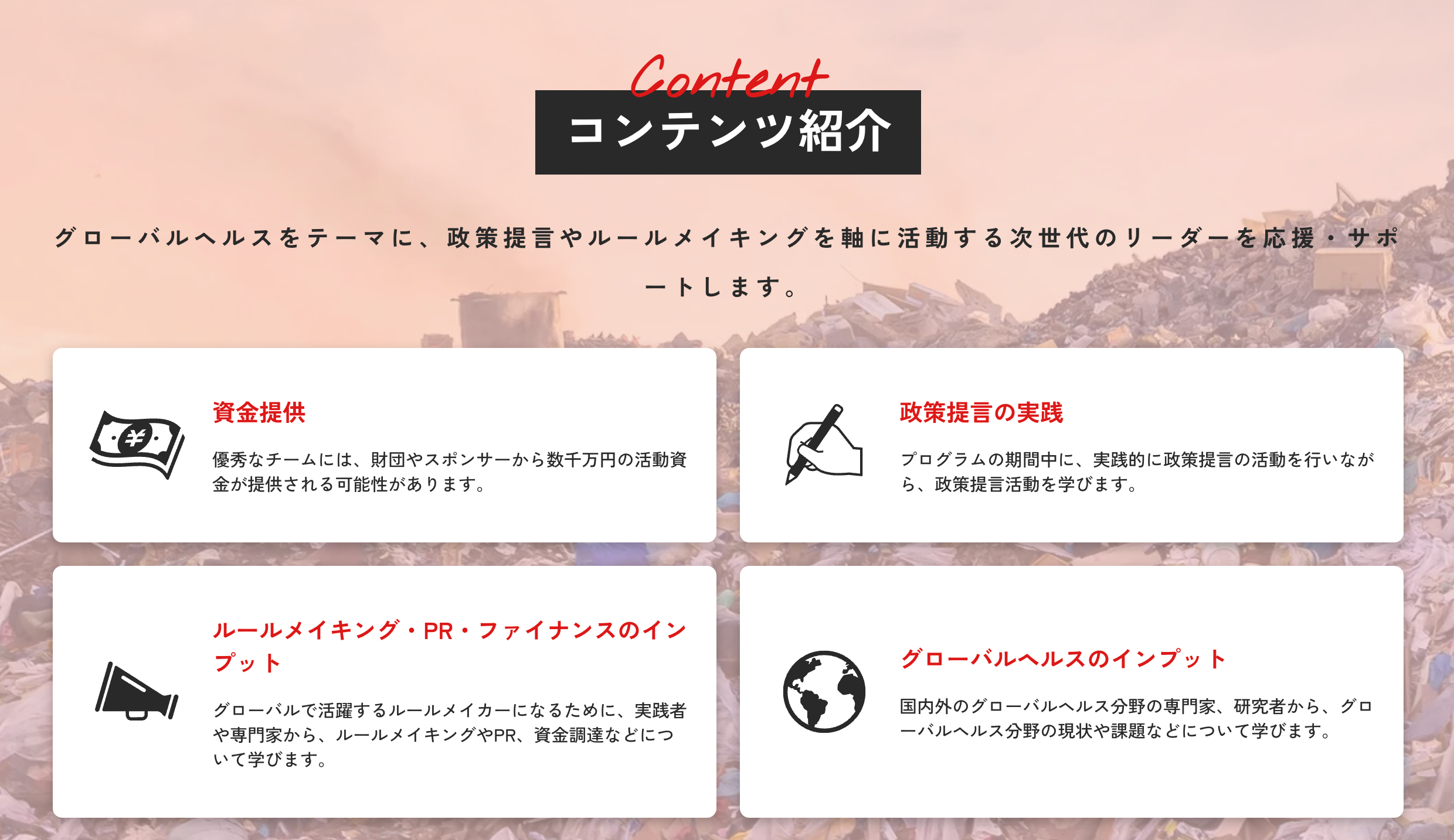 グローバルネットワークやグローバルヘルスの専門的な知見を有するさまざまな団体のご協力をいただき、そこにPoliPoliが持つ若者世代からの政策提言のノウハウをかけあわせたプログラムとなっています。