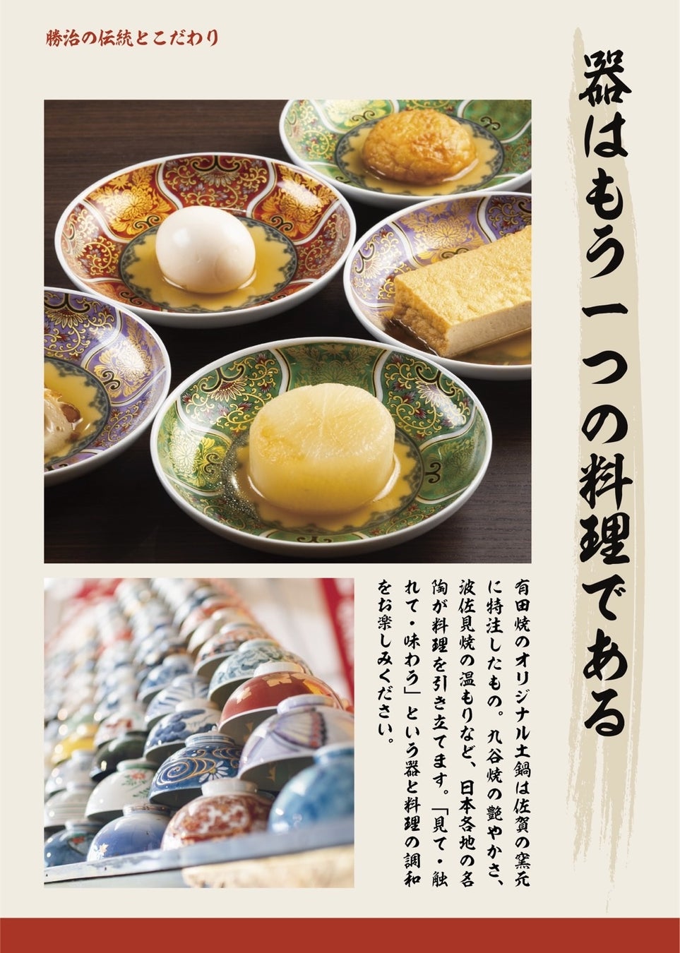 器もまた、料理の一部です。鍋には、佐賀・有田の窯元まで足を運び、特別に焼き上げてもらった“オリジナル有田焼”の土鍋を使用。そのほか、九谷焼の艶やかな彩りや、波佐見焼の温かみある風合いなど、日本を代表する焼き物の産地から、料理を最も美しく引き立てる器を厳選しました。