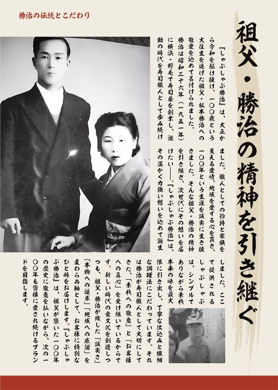「しゃぶしゃぶ勝治」は、大正から令和までの時代を生き抜き、100歳という大往生を遂げた祖父・松本勝治への敬愛を込めて名付けられました。勝治は昭和二十六年(1951年)に横浜・野毛で寿司屋を創業し、激動の時代を寿司職人として誠実に歩み続けました。