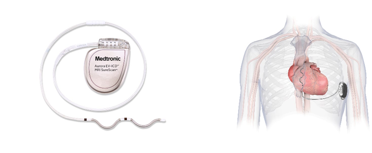 植込み型除細動器は体内に植え込まれて、突然起こった心室細動や心室頻拍を自動的に検知し、電気治療を行って心臓の動きを正常に戻すものです。数センチ大の植込み型除細動器本体と、それにつながるリード線からできています。Aurora EV ICD MRIシステムは、胸骨下にICDリードを留置するこれまでにない画期的なシステムで、血管内にリードを留置する必要がないため、従来の経静脈ICDと比べて低侵襲な植込み機器です。Aurora EV ICD(TM) MRIデバイスは、従来の経静脈ICDと同様のサイズ、形状、電池寿命を持ちます。血管外にICDリードを留置する植込み型除細動器として、唯一、抗頻拍ペーシング(ATP)を用いて致死性頻脈性不整脈の治療を行い、一時的な心静止時にも心休止バックアップペーシング治療を提供します。