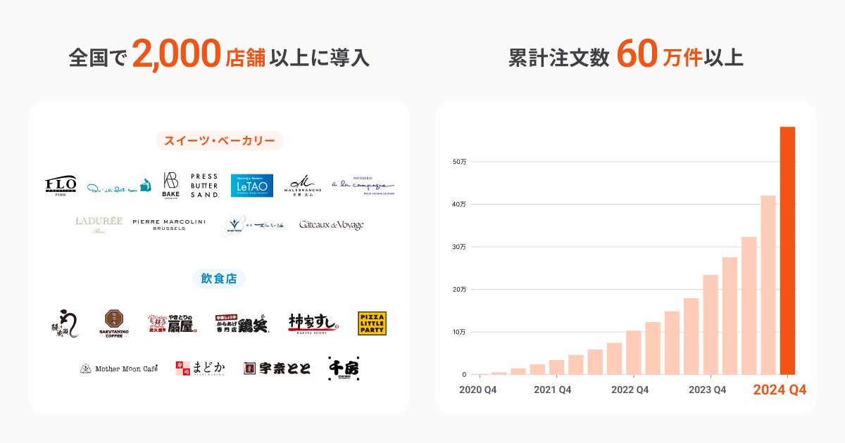 現在、「テイクイーツ」は全国2,000店舗以上で導入され、累計注文回数は60万件を突破しています(2025年1月時点)。