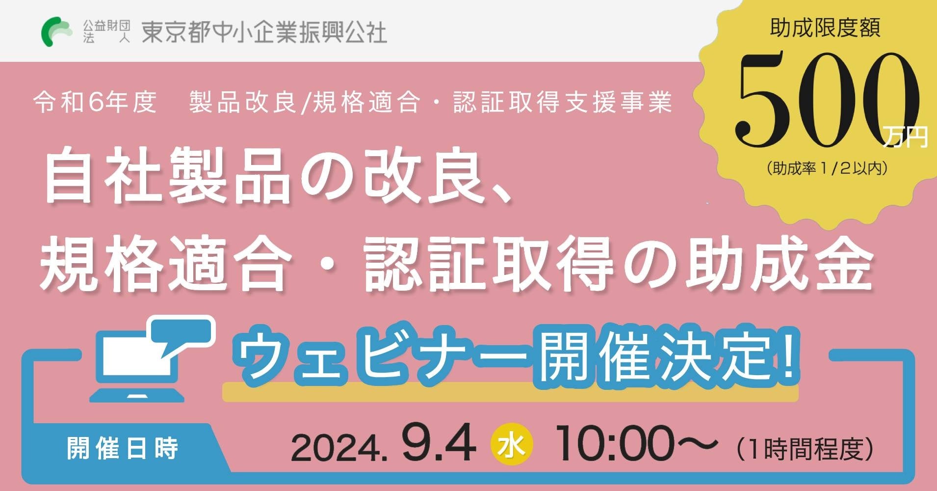 公益財団法人 東京都中小企業振興公社(本社:東京都千代田区、理事長:中西 充)は、国内外の新たな販路開拓を目指す都内中小企業者等の経営力を強化し、東京の産業の活性化を図ることを目的とする「製品改良/規格適合・認証取得支援事業」について、制度や申請のポイントを説明するウェビナーを9月4日(水)に開催します。