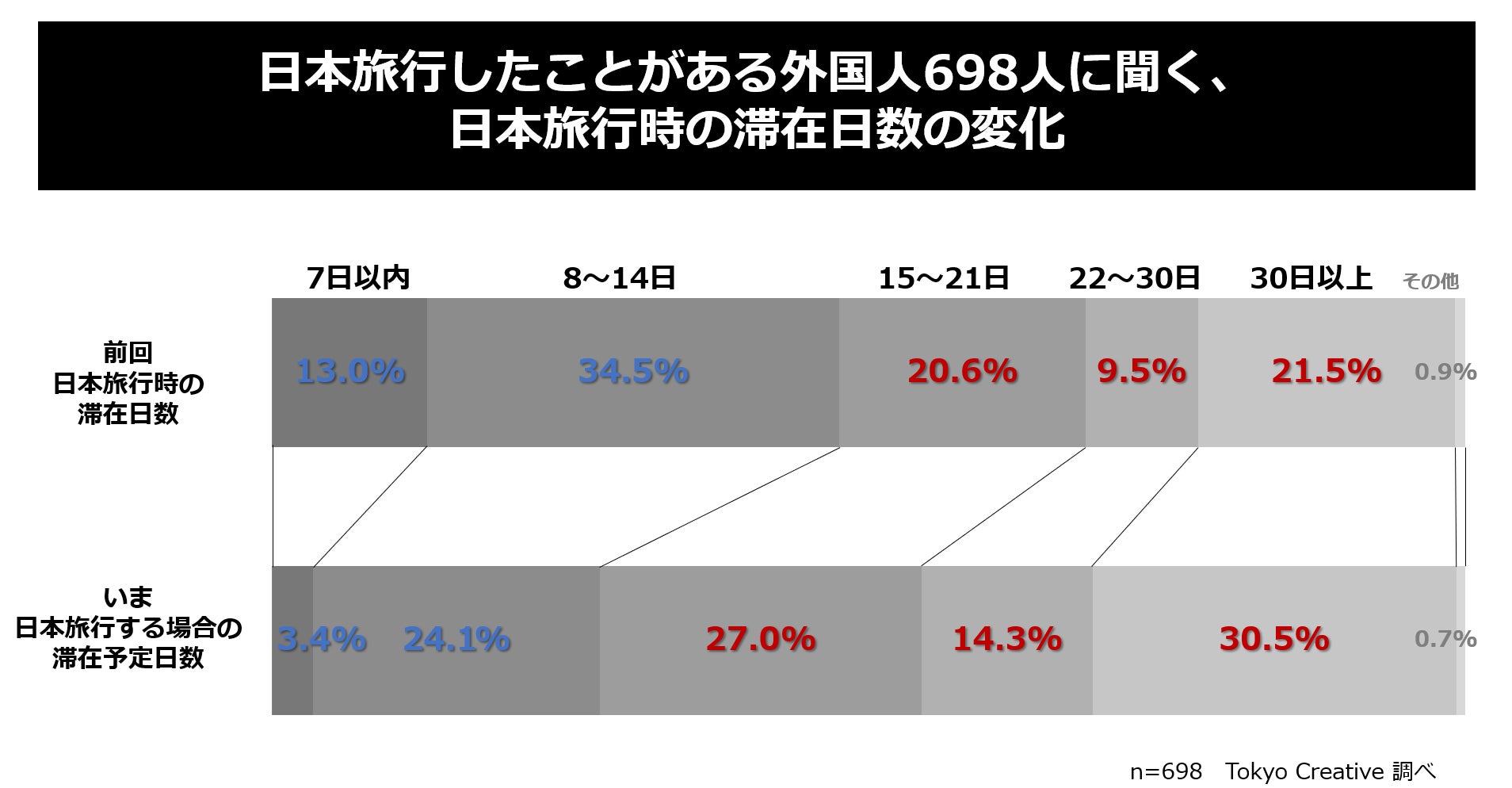 日本旅行したことがある外国人698人に聞く、日本旅行時の滞在日数の変化