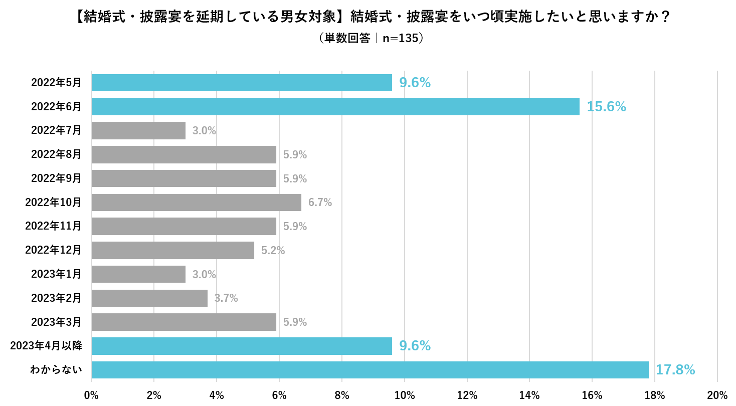 また、現在も結婚式・披露宴を延期していると回答した男女135人に、いつ頃実施したいかを質問したところ、17.8%が「わからない」と回答。次いで「2022年6月」(15.6%)、「2022年5月」(9.6%)、「2023年4月以降」(9.6%)となりました。