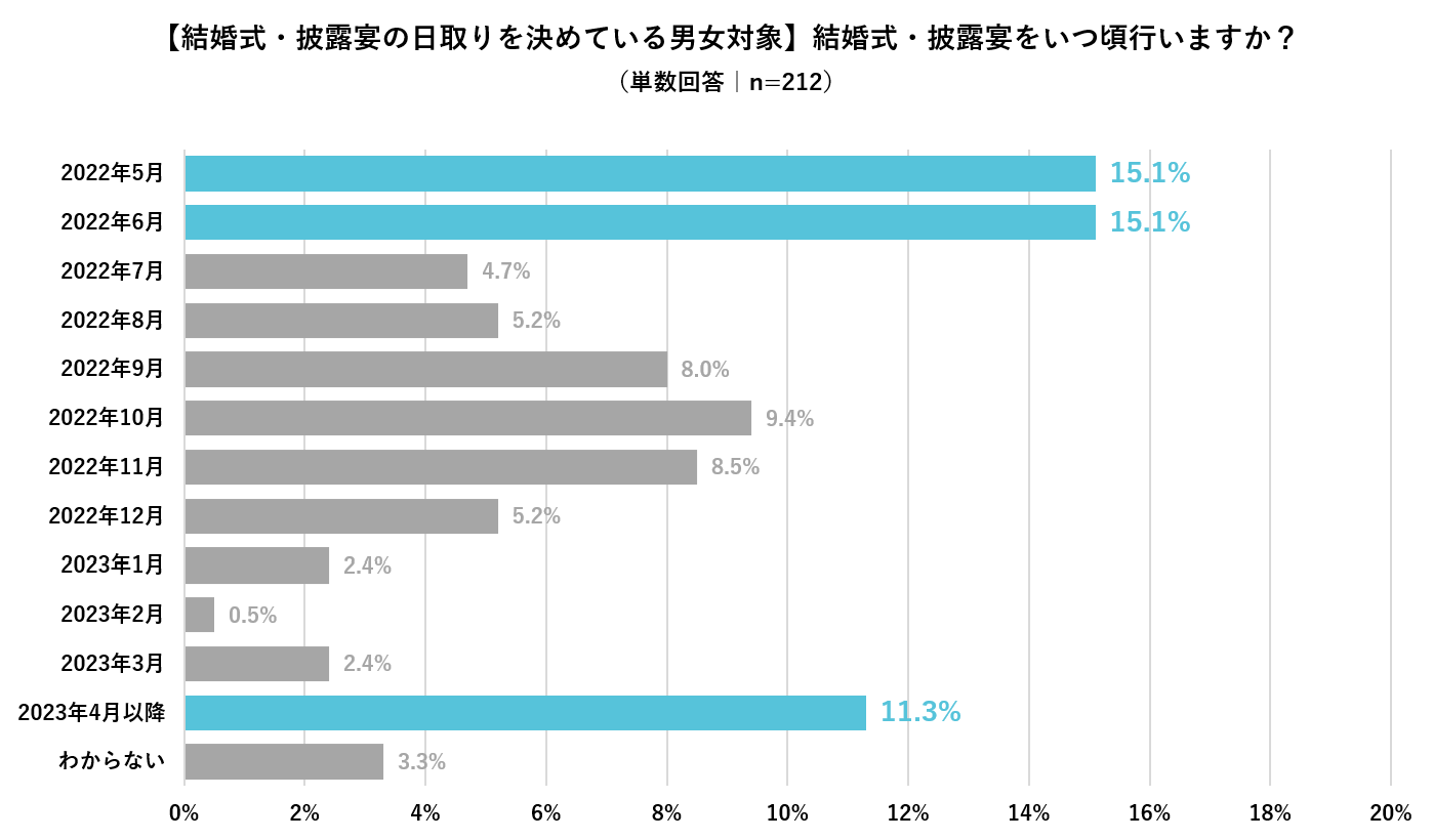 同じく現在、結婚式・披露宴の日取りを決めていると回答した男女212人に、結婚式・披露宴の開催時期を質問したところ、「2022年5月」(15.1%)「2022年6月」(15.1%)が最多の回答となり、次いで「2023年4月以降」(11.3%)となりました。