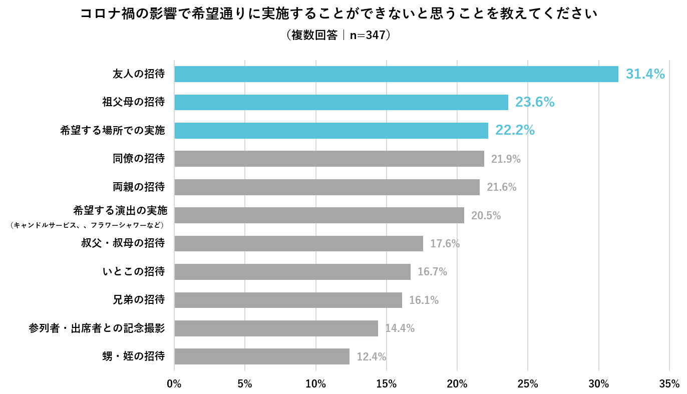 結婚式・披露宴の日取りを決めている、または延期していると回答した男女347人に、結婚式・披露宴に関して、新型コロナウイルス感染症の影響により希望通りに実施することができないと思うことを質問したところ、TOP3は、1位「友人の招待」(31.4%)、2位「祖父母の招待」(23.6%)、3位「希望する場所での実施」(22.2%)となりました。