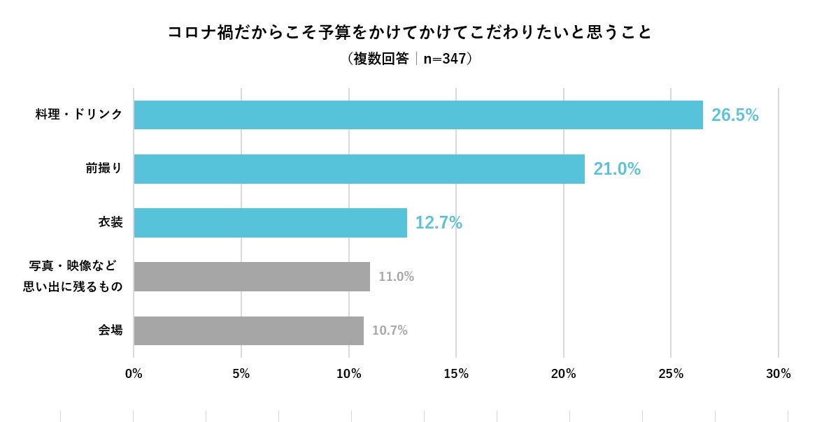 同じく、結婚式・披露宴の日取りを決めている、または延期していると回答した男女347人に、コロナ禍だからこそ予算をかけてこだわりたいことを質問したところ、TOP3は、1位「料理・ドリンク」(26.5%)、2位「前撮り」(21.0%)、3位「衣装」(12.7%)となりました。
