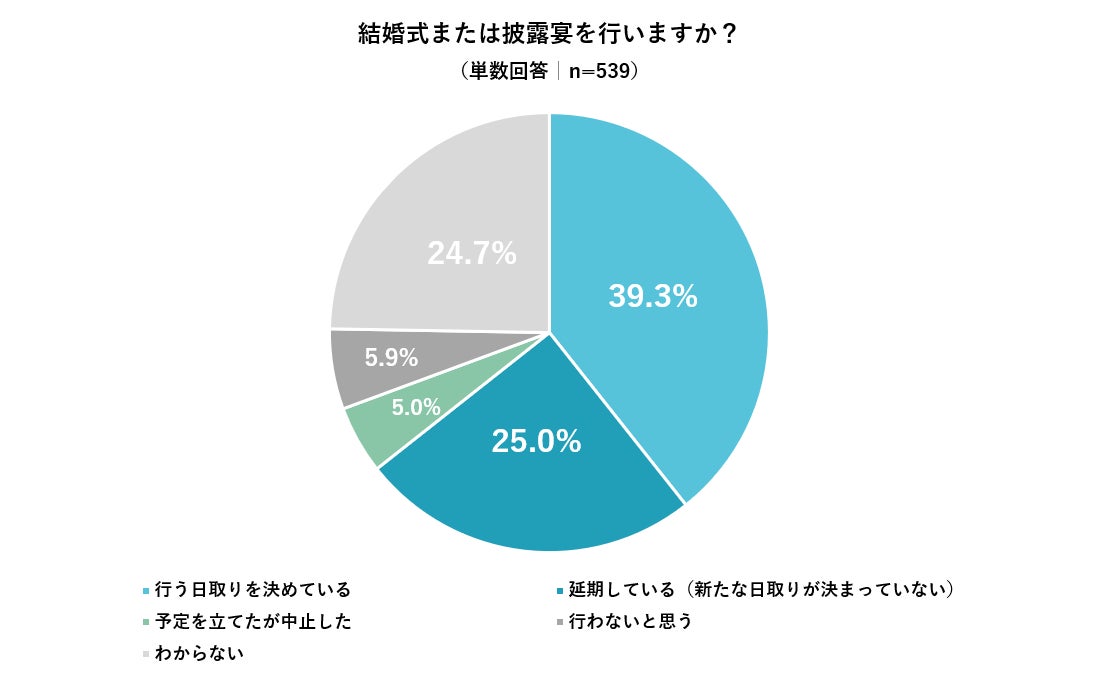 結婚の予定がある男女539人に結婚式・披露宴を行うかを質問したところ、39.3%が「日取りを決めている」、25.0%が「延期している(新たな日取りが決まっていない)」、24.7%が「わからない」と回答しました。