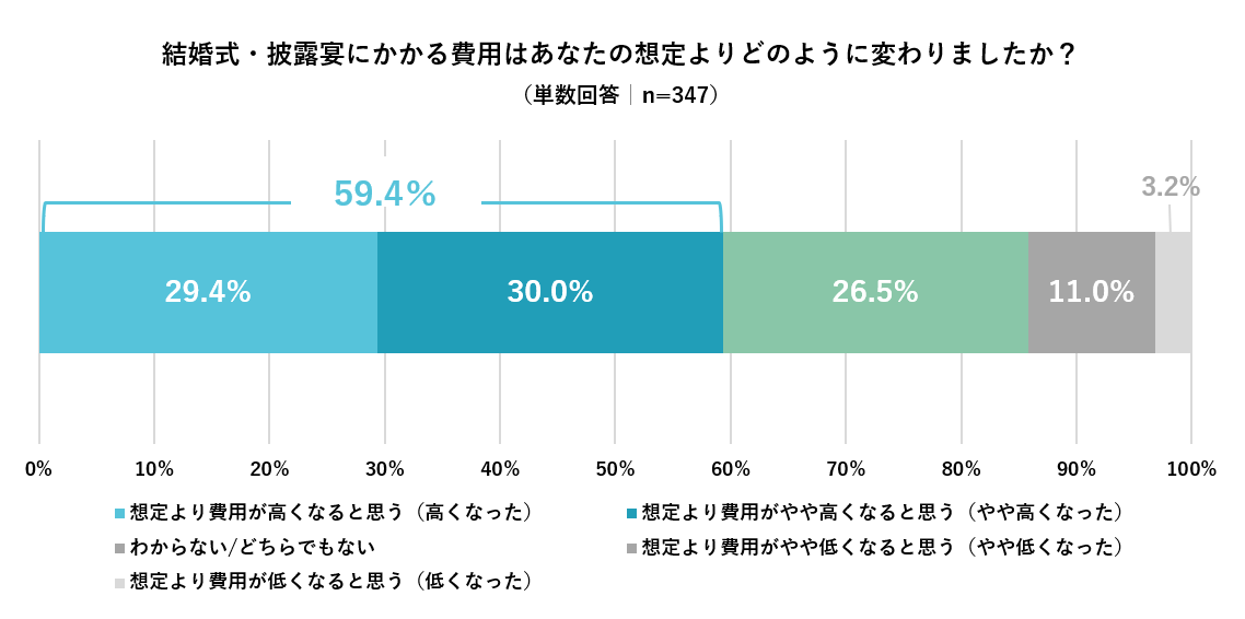 同じく、結婚式・披露宴の日取りを決めている、または延期していると回答した男女347人に、新型コロナウイルス感染症の影響によって、結婚式・披露宴にかかる費用が想定より変化したかを質問したところ、「想定より費用が高くなると思う(高くなった)」(29.4%)、「想定より費用がやや高くなると思う(やや高くなった)」(30.0%)となり、合わせて59.4%が想定よりも高くなった(高くなると思う)と回答しました。