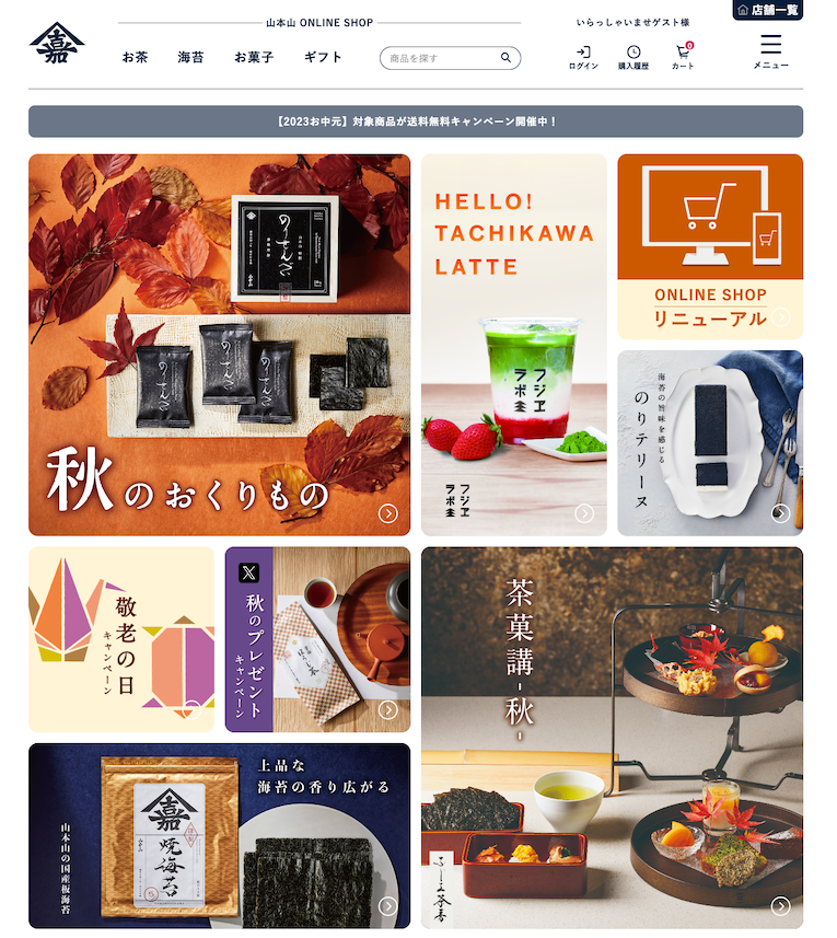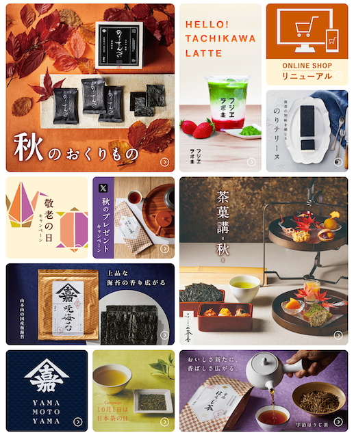 新商品や店舗情報、プロモーション情報などを、それぞれ大きさの異なるスクエア型のビジュアルで表示することで、山本山の旬の情報や推しの情報にすぐにアクセスできるサイトデザインになっています。