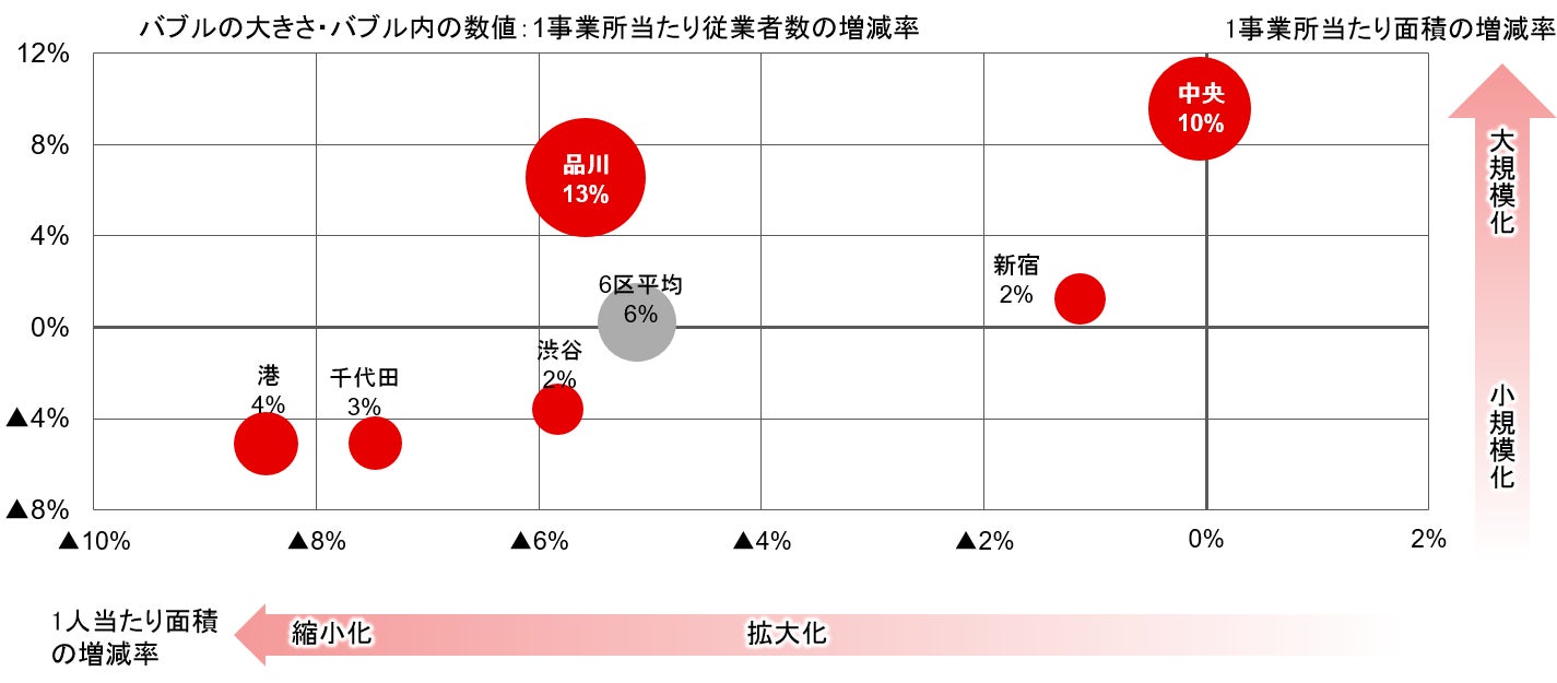 (注) 事業所面積は延床面積ベースのため、一般的な目安とされる1人当たりオフィス面積(3坪前後)とは異なる。千代田区や港区は1人当たり面積が減少しているが、絶対面積は広いため、スペースの不足感は相対的に小さいと思われる。