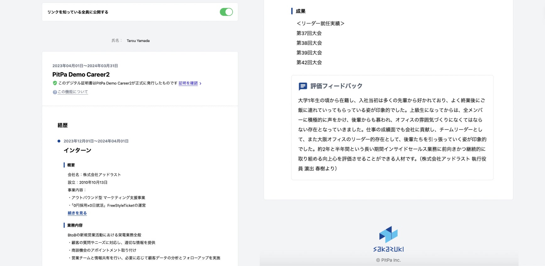 本証明書の発行には、DOUが提供する「キャリア証明書」の発行システム「sakazuki(サカズキ)」を利用しています。具体的な内容としては、インターン期間中の業務内容、リーダシップ経験数、およびアッドラスト社執行役員からの評価フィードバックなどが記載されています。