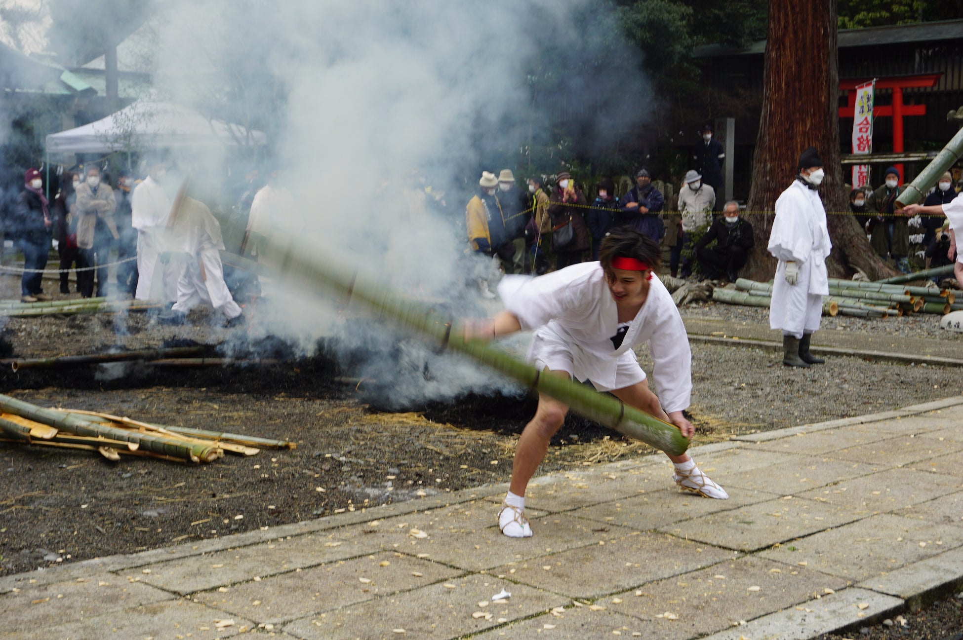 「竹割まつり」とも呼ばれる御願神事は、加賀市で毎年2月10日に行われる祭りです。毎年、菅生石部(すごういそべ)神社で行われ、石川県無形民俗文化財にも指定されています。祭りが近づくと大蛇になぞらえた大縄をつくり、青竹が約400本用意されます。当日は、地元の若者が青竹を石段や石畳に叩きつけ、割りつくし、最後は大蛇にみたてた大縄を川へ投げ込むことで、無病息災と五穀豊穣を祈るというものになっています。割られた竹は見物人が持ち帰り、魔除けのため玄関に置いたり、箸にして健康・病気平癒・虫歯予防を願います。