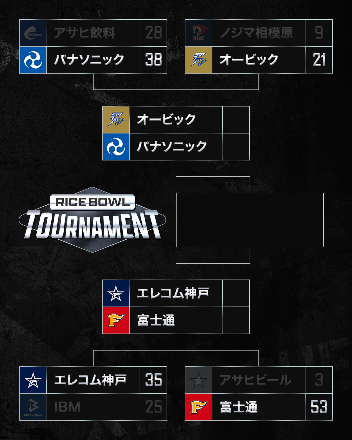 ライスボウルトーナメントに駒を進めたのはパナソニック インパルス、IBM BIG BLUE、ノジマ相模原ライズ、アサヒビールシルバースター、富士通フロンティアーズ、オービックシーガルズ、エレコム神戸ファイニーズ、アサヒ飲料クラブチャレンジャーズの 8チーム。そして、クオーターファイナルで勝利してセミファイナルに出場するのは昨年のライスボウル覇者・富士通、パナソニック、オービック、エレコム神戸の 4 チーム。日本一の座を懸けた 4 強の熱い闘いにご期待ください。