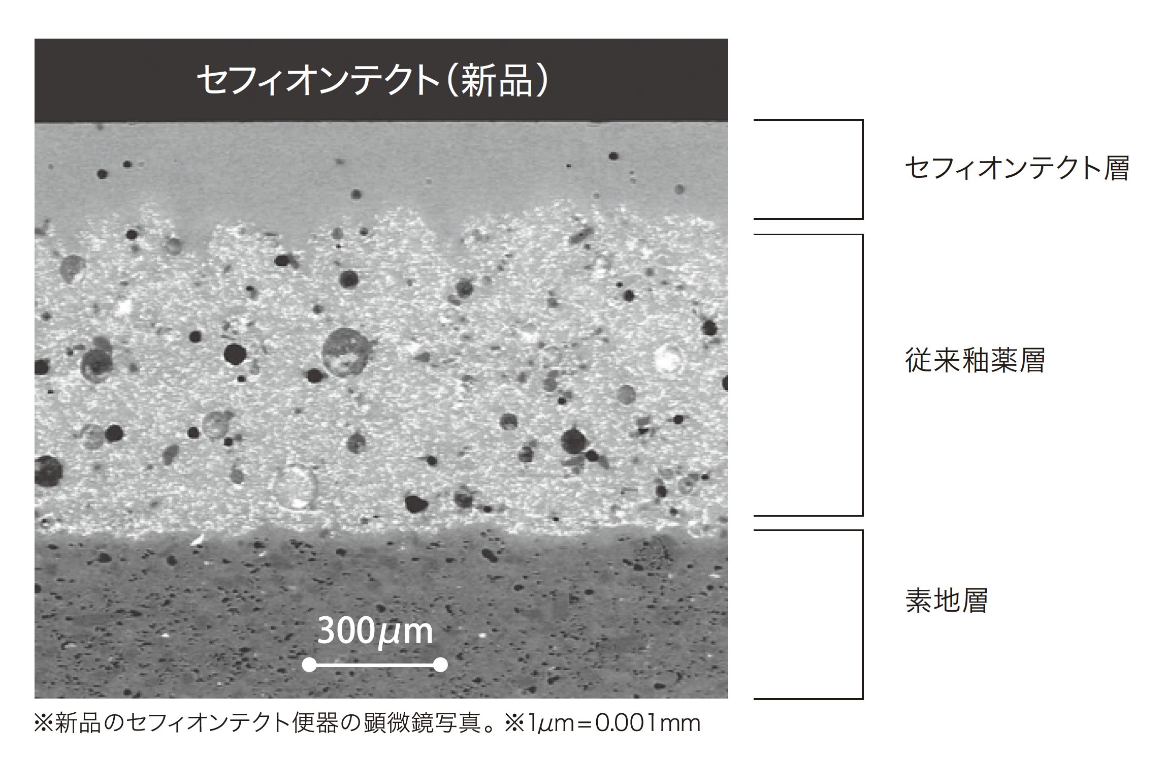 陶器表面の凹凸を100万分の1mmのナノレベルでなめらかに仕上げ、汚れが付きにくく落ちやすいTOTO独自の技術です。純度の高いガラス層を約1200℃の窯で焼き付けたことで、美しさが持続します。従来の釉薬の上に、高温で溶かした純度の高いガラス層を均一に形成。また優れた耐久性(※12)・耐薬品性があり、長期使用にもしっかり耐える品質を実現。陶器の美しい輝きを、ずっと守り続けます。また、セフィオンテクトは親水性が高く、水になじみやすいので、汚物をすっと流れやすくします。
