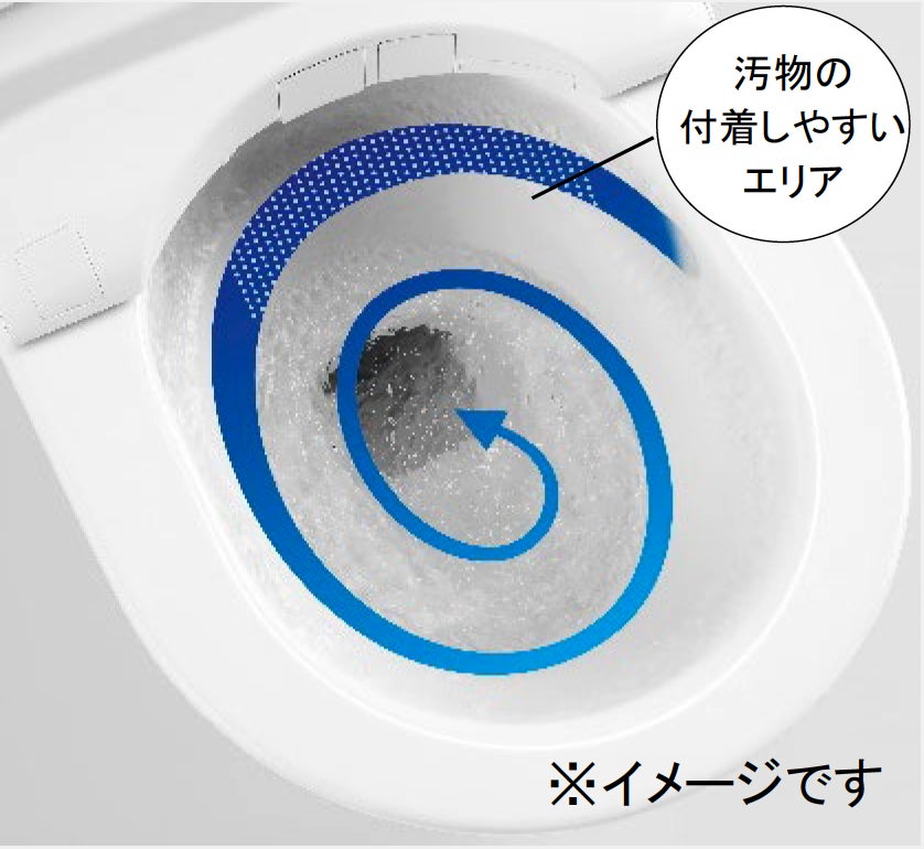 渦を巻くようなトルネード洗浄が、少ない水で効率的に洗浄します。汚物が付着しやすい便器後方に勢いよく水が当たるので、汚れをしっかり洗い流します。また便器正面から吐水口が見えないので、すっきりとした見た目を実現します