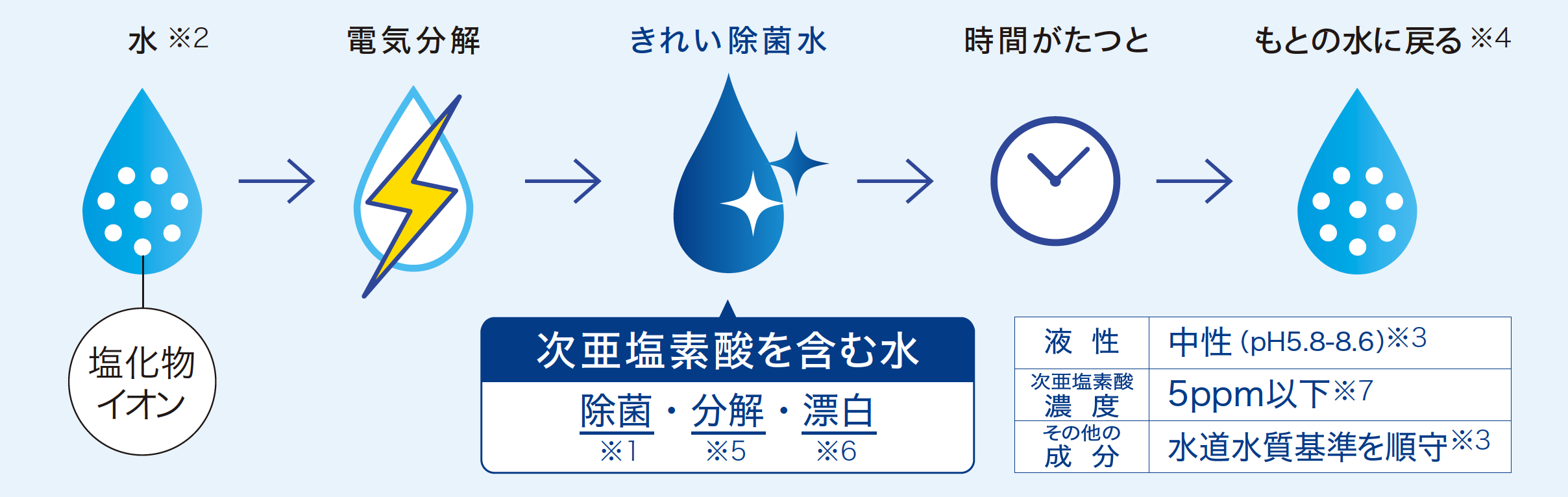 「きれい除菌水」(※1)は、水(※2)に含まれる塩化物イオンを電気分解して作られる除菌成分(次亜塩素酸)を含む水です。薬品や洗剤を使わず、水から作られます。次亜塩素酸は安全性の観点から水道水質基準(※3)の範囲内の濃度で作られており、安全(※3)で、さらに時間がたつともとの水に戻る(※4)ので環境にやさしいのが特長です。